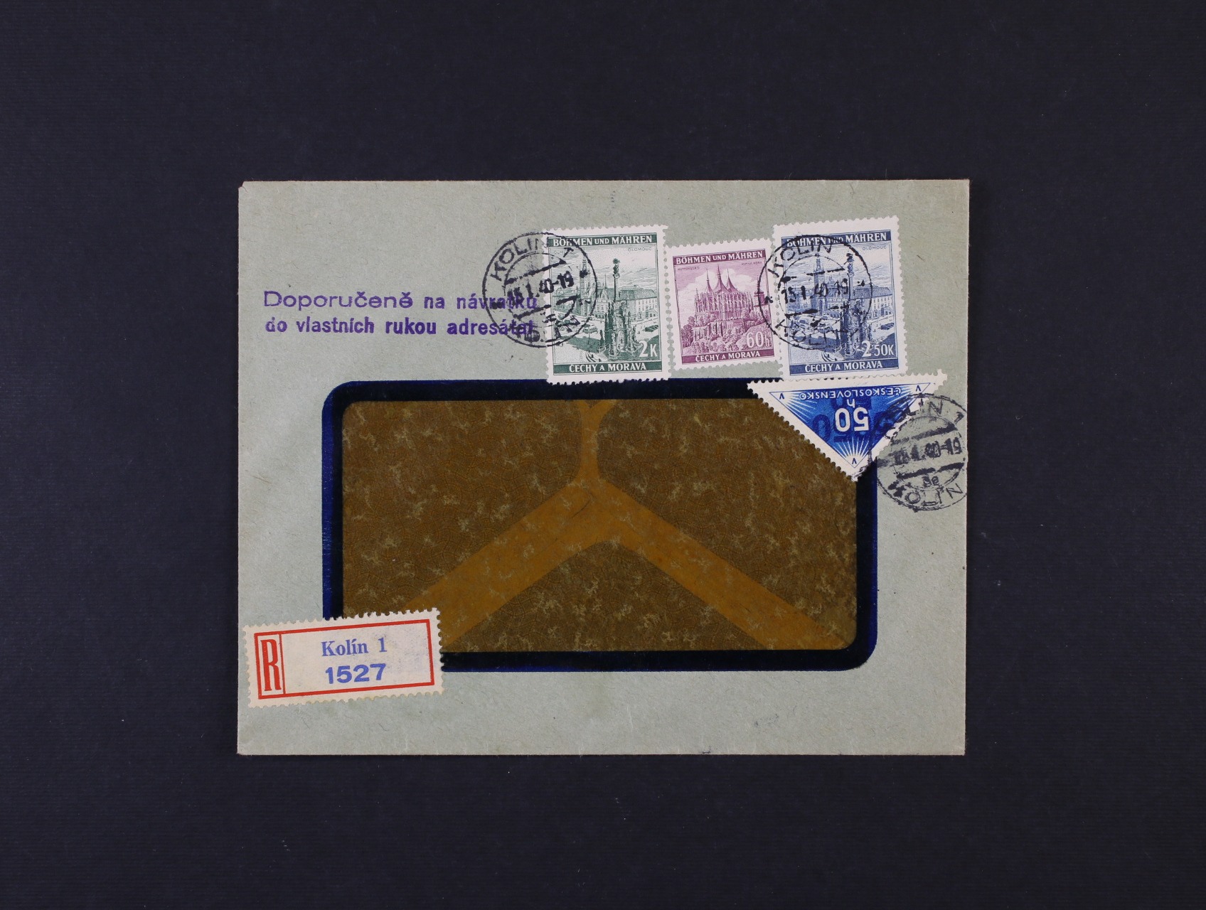 firemní okénkový R-dopis Živnostenské banky v Kolíně frank. protektor. výpl. zn. + čs. doruční zn. DR 1, denní raz. KOLÍN 15.1.1940 + přídavné dvouřádk. raz. Doporučeně na návratku do vlastních rukou adresáta