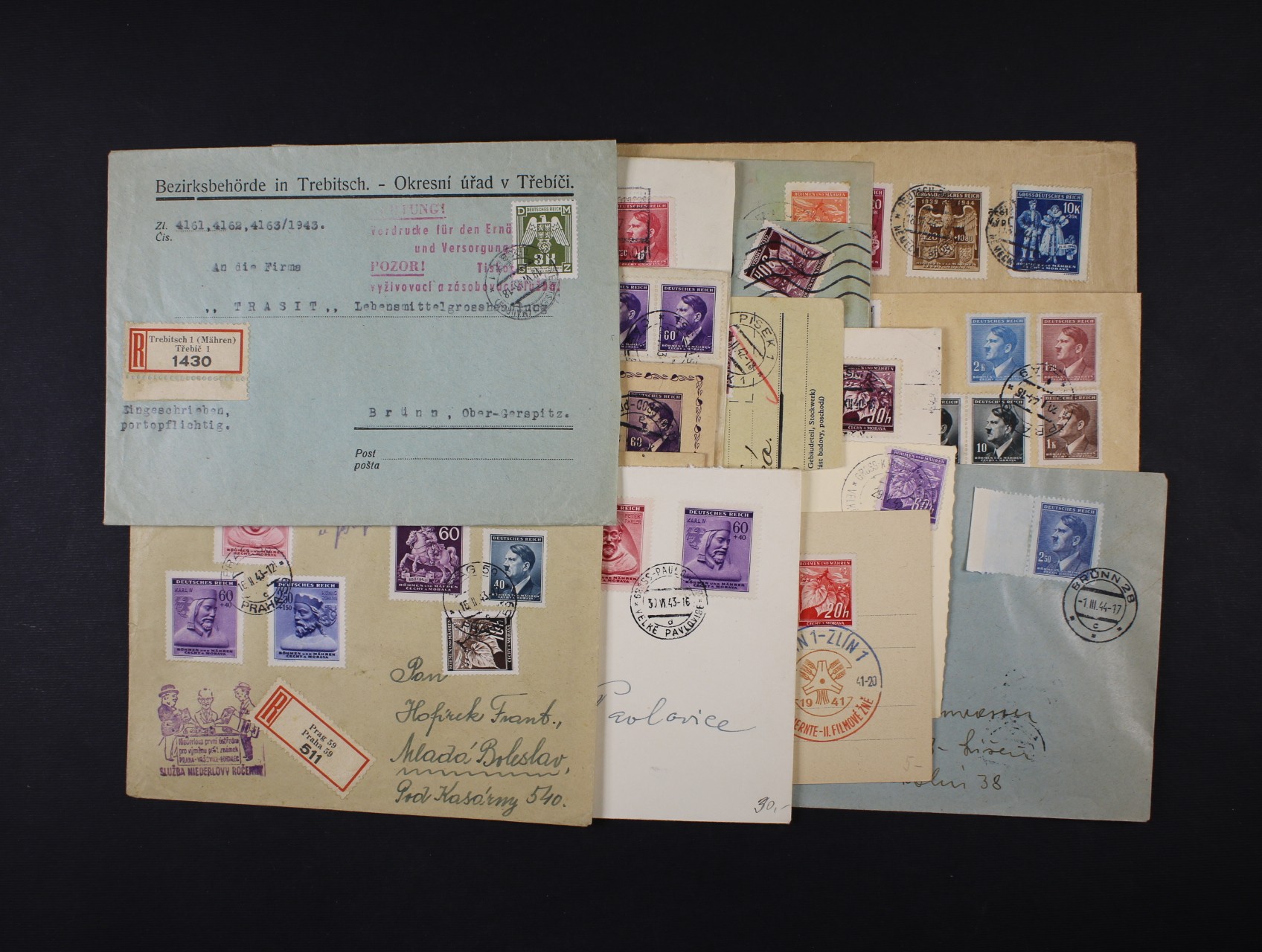 sestava 9 ks celistvostí (1x R-dobírka, 5x RECO), zajímavé, pestré a vysoké frankatury, mj. novinový rukáv adresovaný na prezidenta Dr. Emila Háchu, zajímavé