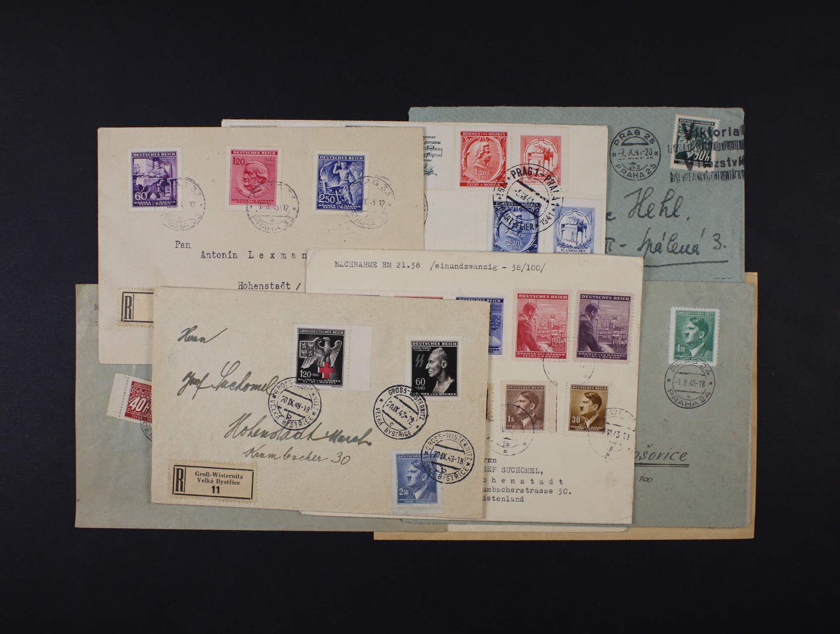 sestava 4 ks kompl. pošt. průvodek do Prahy z let 1941 - 42, frank. pestrými vysokými frankaturami, dobrá kvalita