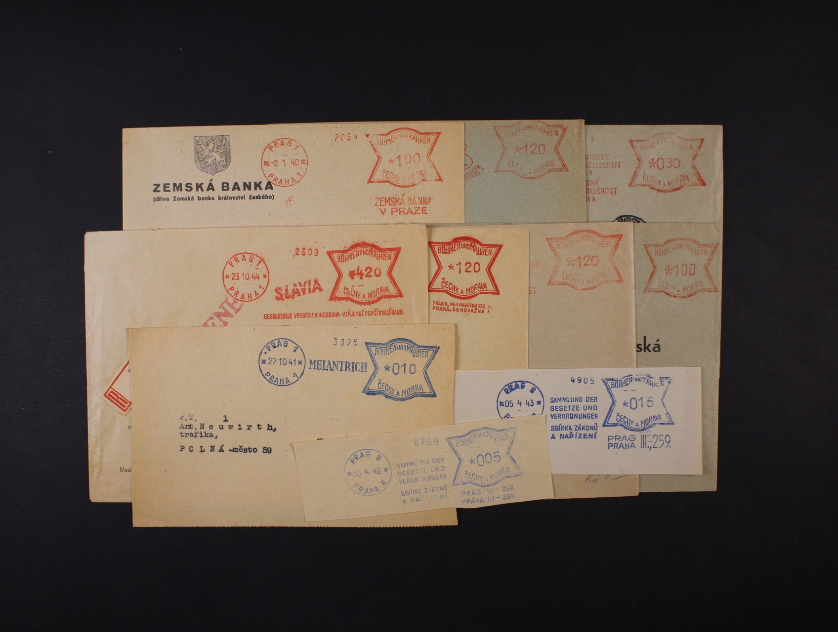 sestava 8 ks firemních celistvostí (1x RECO) s červenými frankotypy + jeden adresní lístek s modrým frankotypem PRAG 1 27.10.41 MELANTRICH, zajímavé