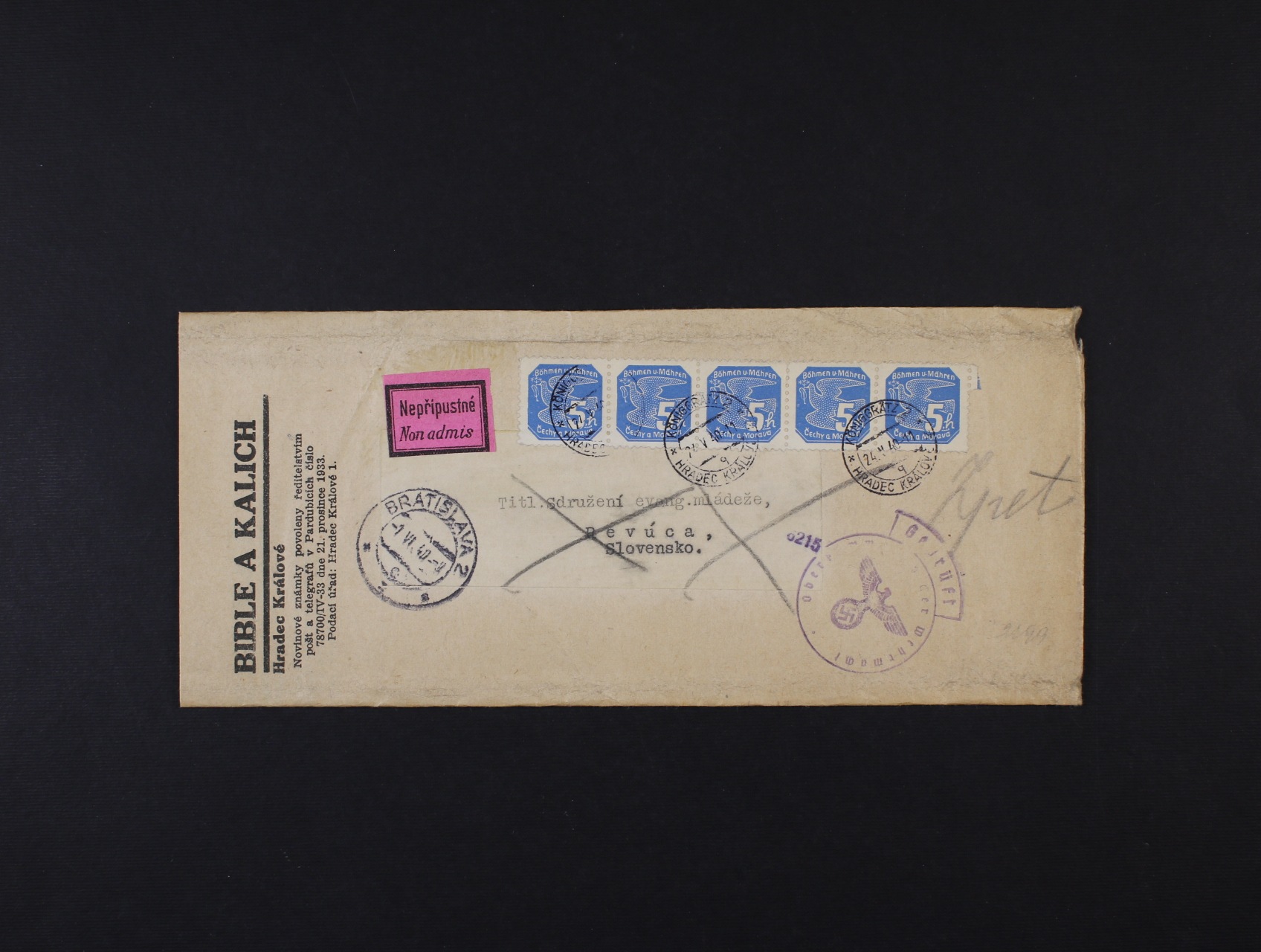 novinový rukáv na Slovensko do Revuce frank. 5ti-páskou zn. NV č. 2 se soukr. perforací, pod. raz. HRADEC KRÁLOVÉ 24.5.40 + raz. něm. cenzury + DR BRATISLAV 2 1.6.40, dvojjazyčná přídavná nálepka Nepřípustné a ruční poznámka Zpět