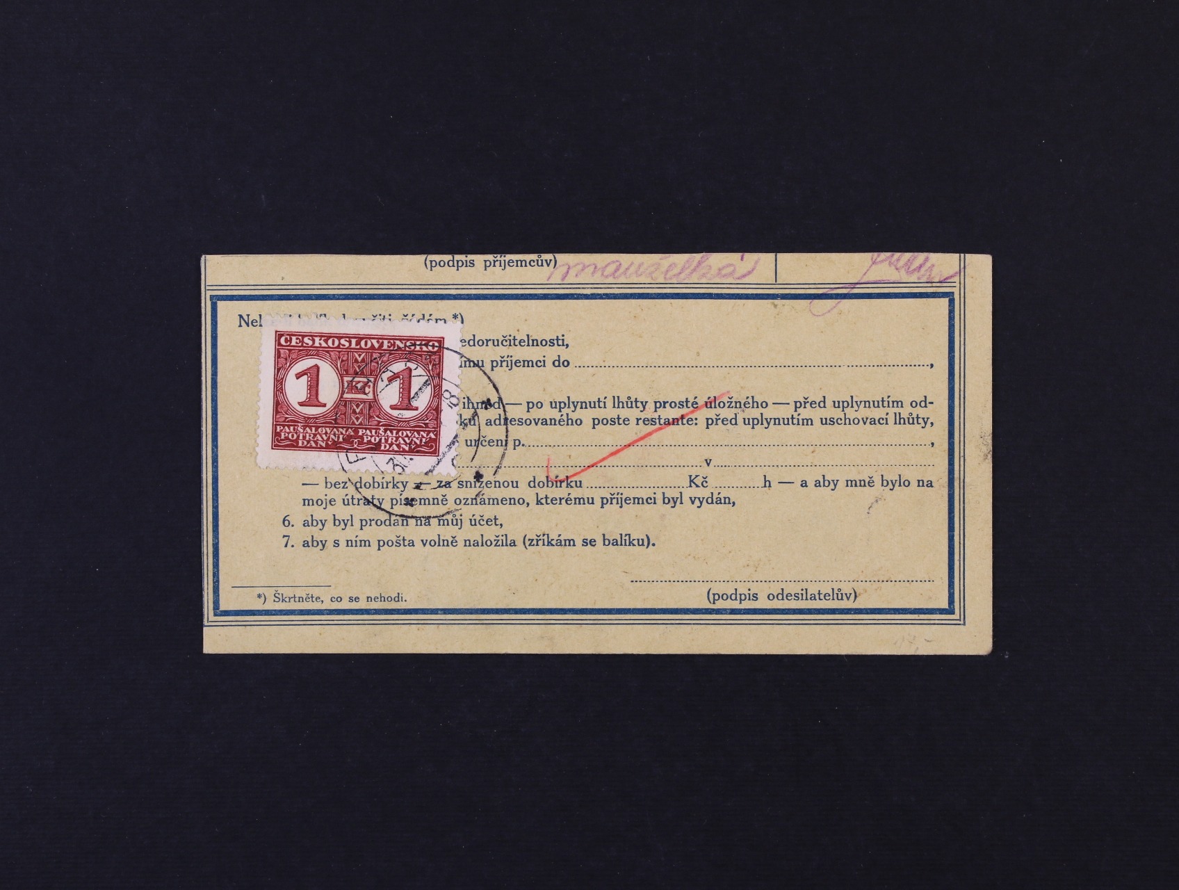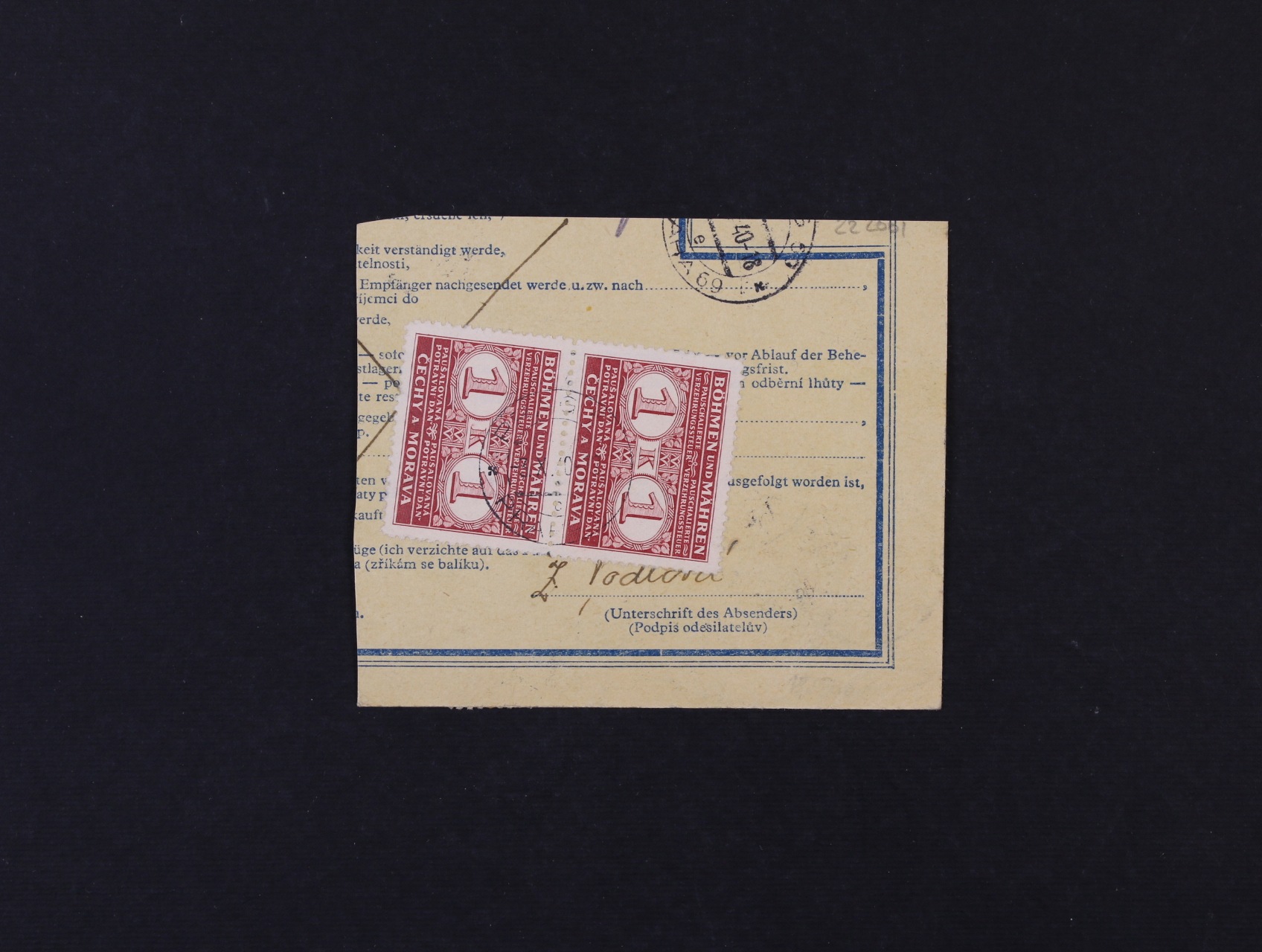 Potravinová daň - ústřižek pošt. průvodky frank. na přední str. zn. č. 33 a 38, pod. raz. ÚSOBÍ 28.11.39, na zadní str. zn. PD č. 10 B se spodním okrajem s DR PRAHA 66 30.11.39,