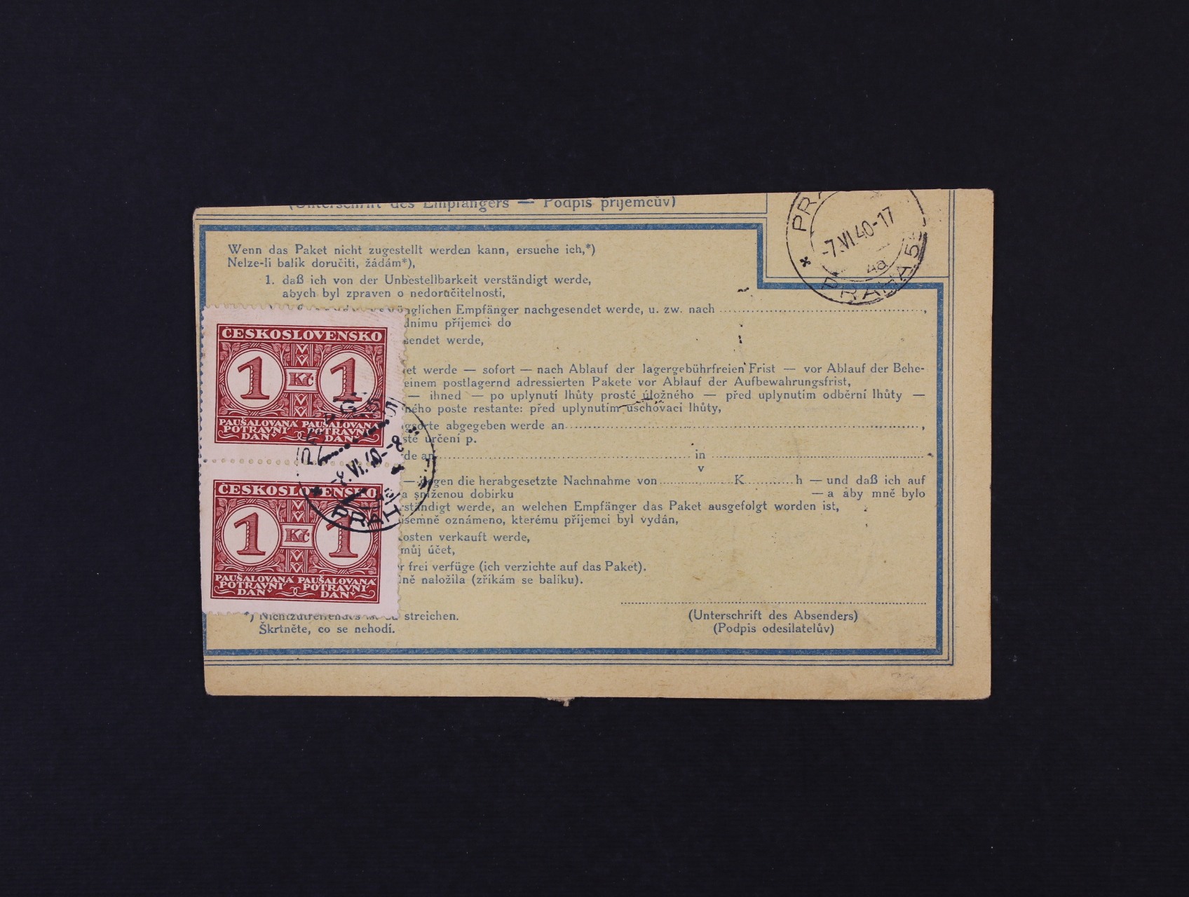 Potravinová daň - ústřižek pošt. průvodky frank. zn. č. 29 ve dvoupásce, 34 a 39, pod. raz. BRÜNN 6.6.40, na zadní str. svislá dvoupáska zn. PD 9 B s DR PRAHA 5 7.6.40