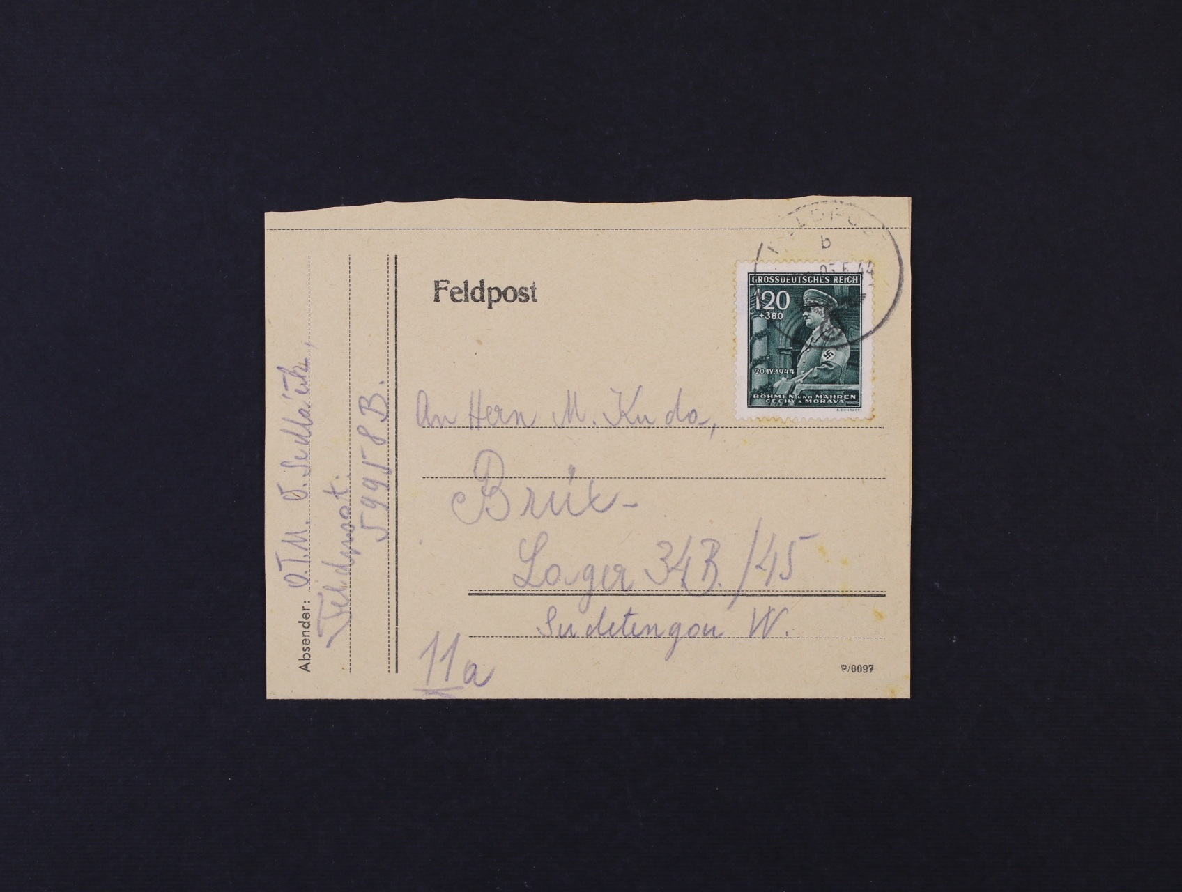 předtištěná zálepka PP od příslušníka O. T. M., frank. protektor. zn. a zaslaná do Lagru 34 B/45 Brüx, pod. raz. FELDPOST 5.5.44, zajímavé