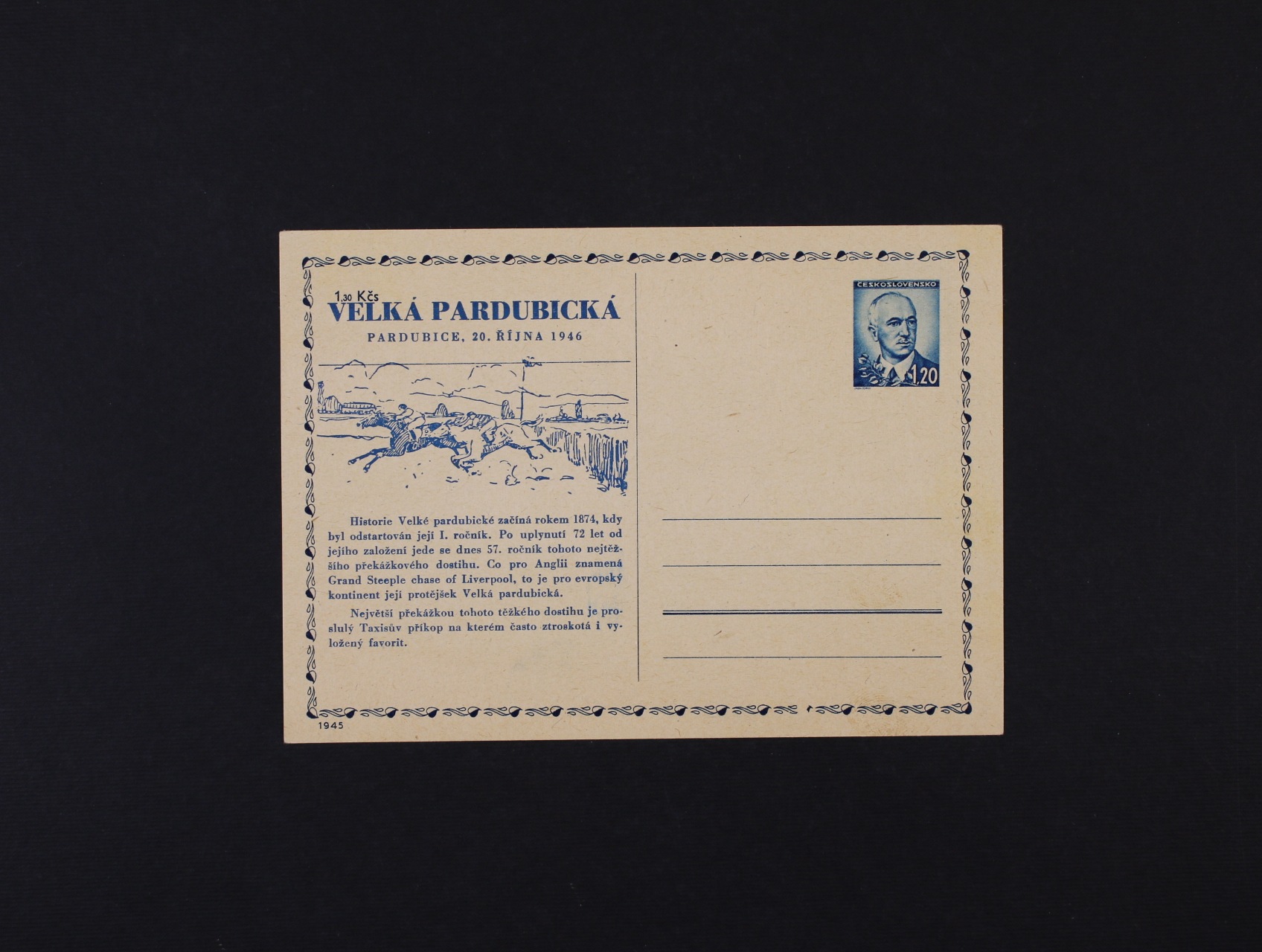 1123 CDV č. 83 s přítiskem VELKÁ PARDUBICKÁ 20.ŘÍJNA 1946, nepoužitá, lux. kvalita 200