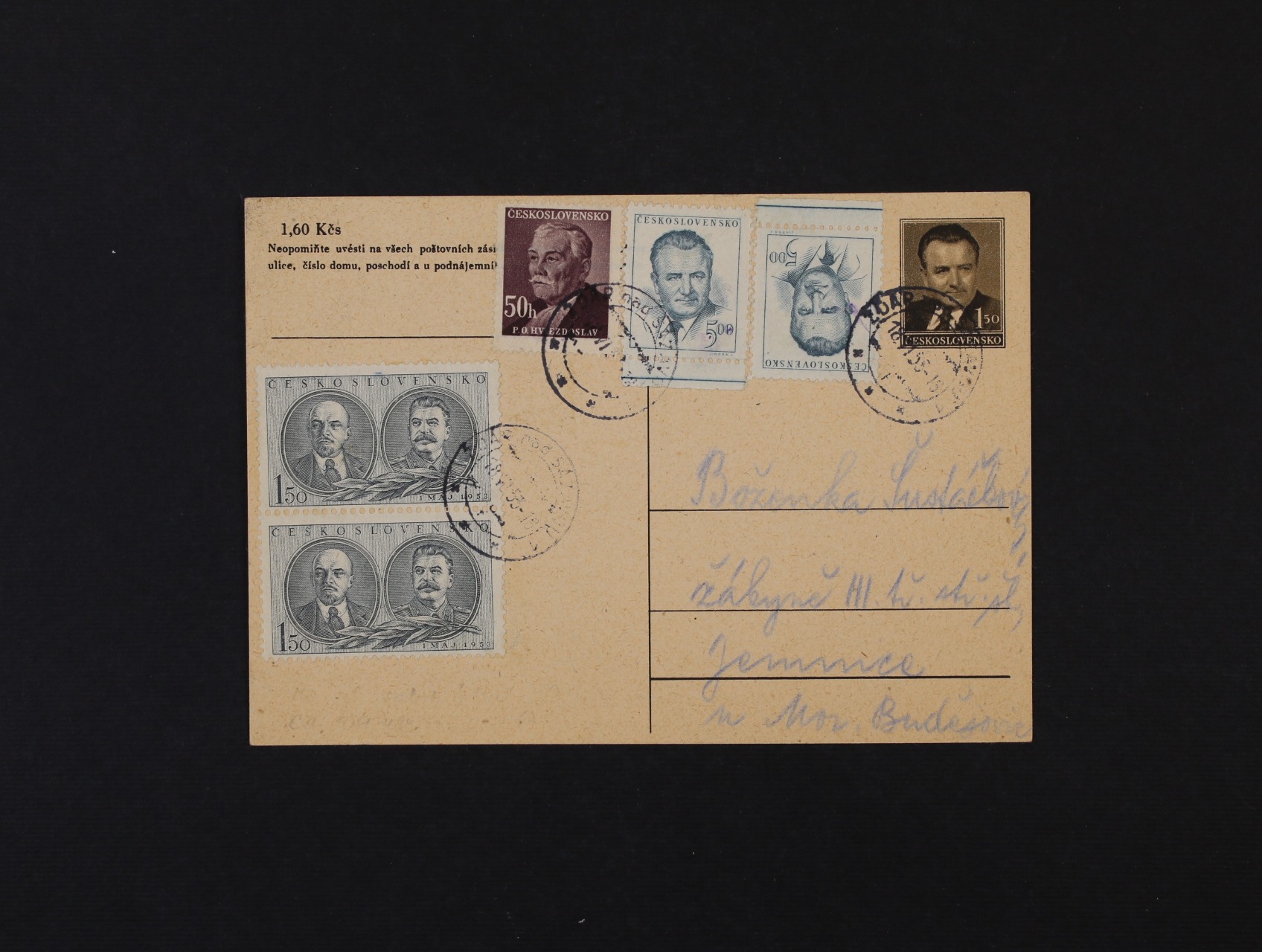 1130 CDV č. 109, použité za měnové reformy, dofrank. zn. č. 679 a 713 (čtyřpáska), pod. raz. PRAHA 3.6.53 + přích. prezenční raz., zajímavé 300