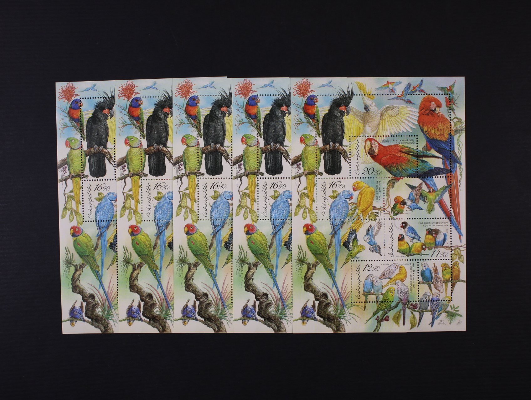 zn. č. A409-12 Papoušci, sestava 5ks aršíků s různými VV podle katalogu Pofis - 1x nedotažený obrys zobáku, 1x s posunem barvy, 1x se skvrnami na koncích listů, 1x s vychýleným perf. otvorem a 1x bez černého obrysu hlavy