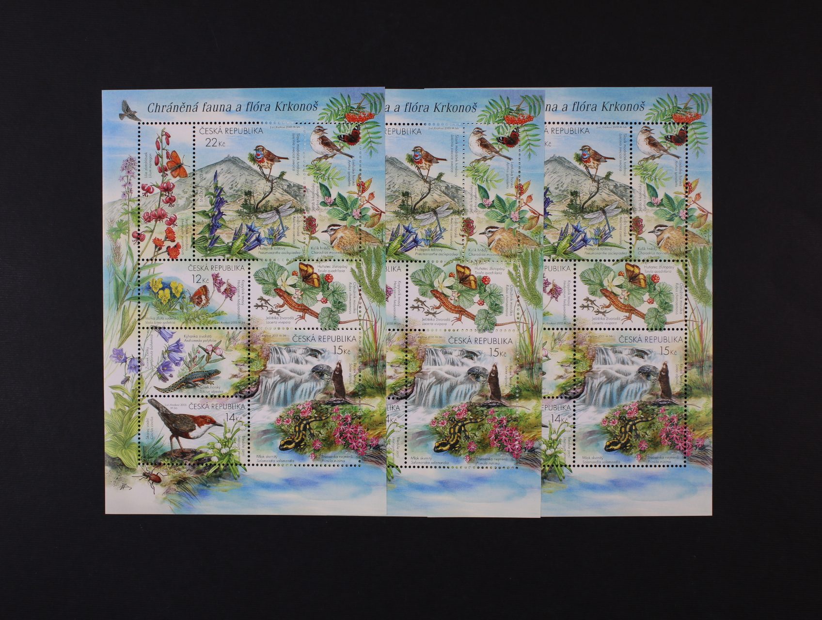 zn. č. A439-42 Krkonoše, varianty A, sestava 3ks aršíků z toho jeden bez tmavozelené skvrny v listu, 2x s tmavozelenou skvrnou + VV OT - na jednom výrazná skvrna mezi stonky a 1x nevýrazná
