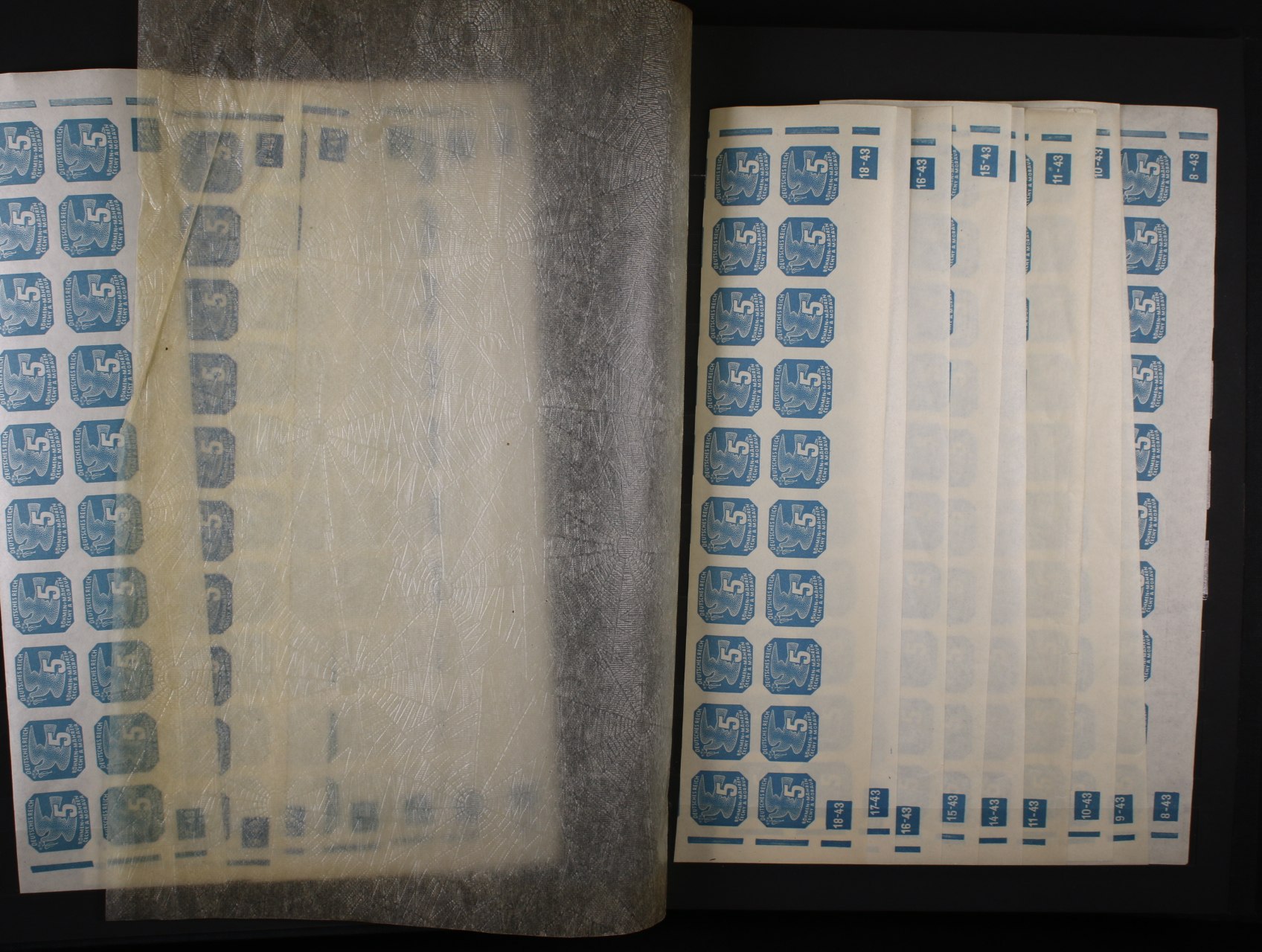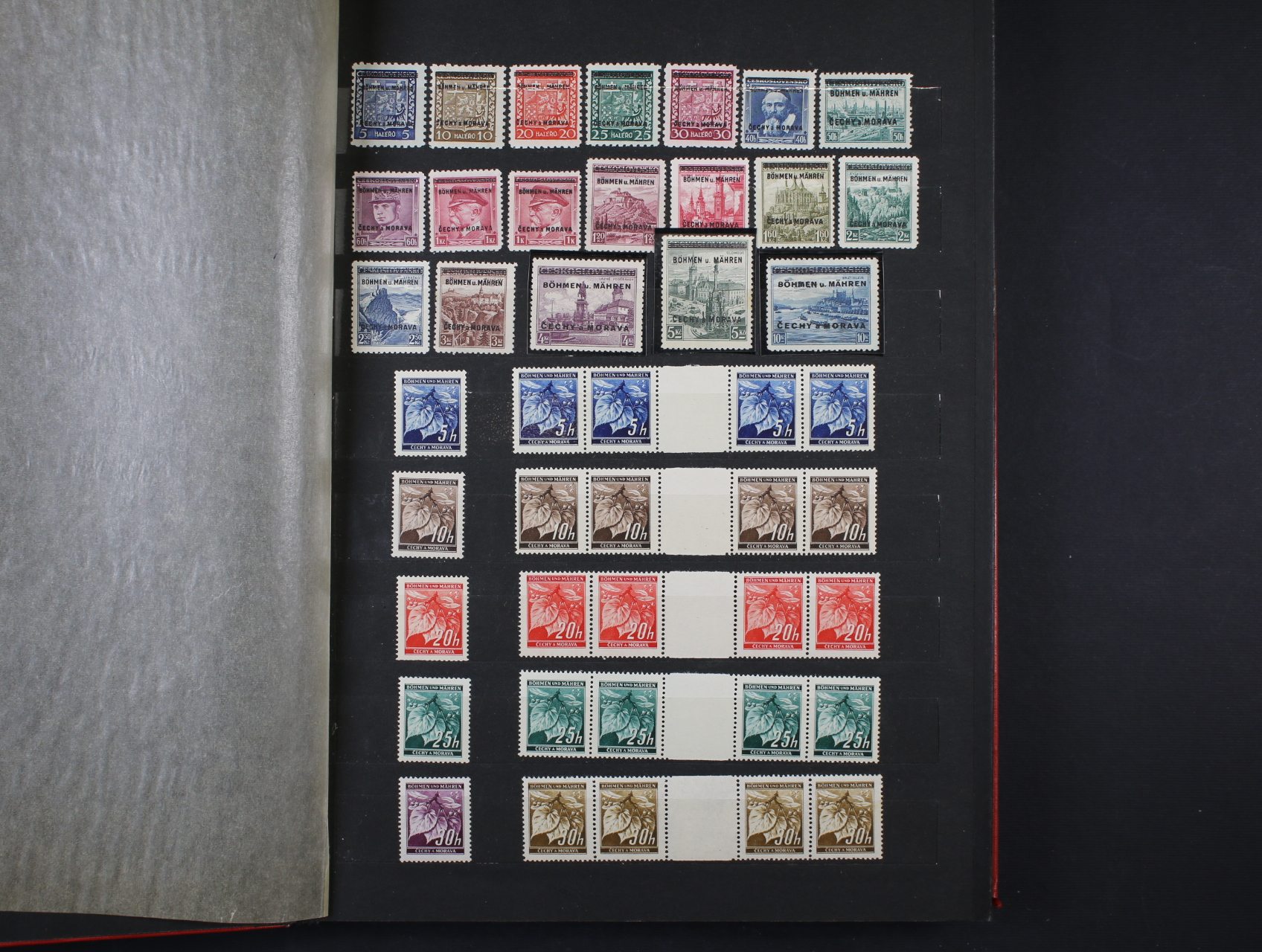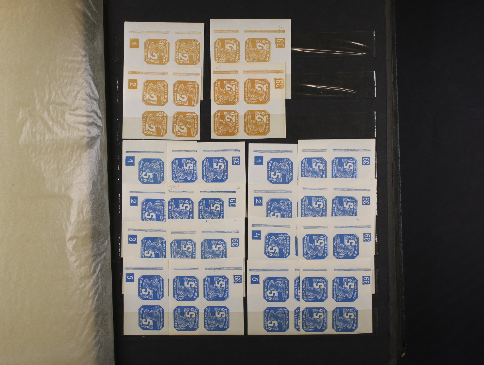 1333 Protektorát - sbírka svěžích zn. NV č. 10 - NV 18 ve 20ti-pásech s DZ, OT 1 20ti-pásy s DZ 1 39, 2 39 + pravé a levé čtyřbloky s DZ 1 39, 2 39, DZ 2 39 s trojúhelníčkem, zn. NV 10 - NV 18 - pravé a levé čtyřbloky, neúplná sestava, kat. cena cca 20000 Kč, uloženo v černém zásobníku A 4 8600