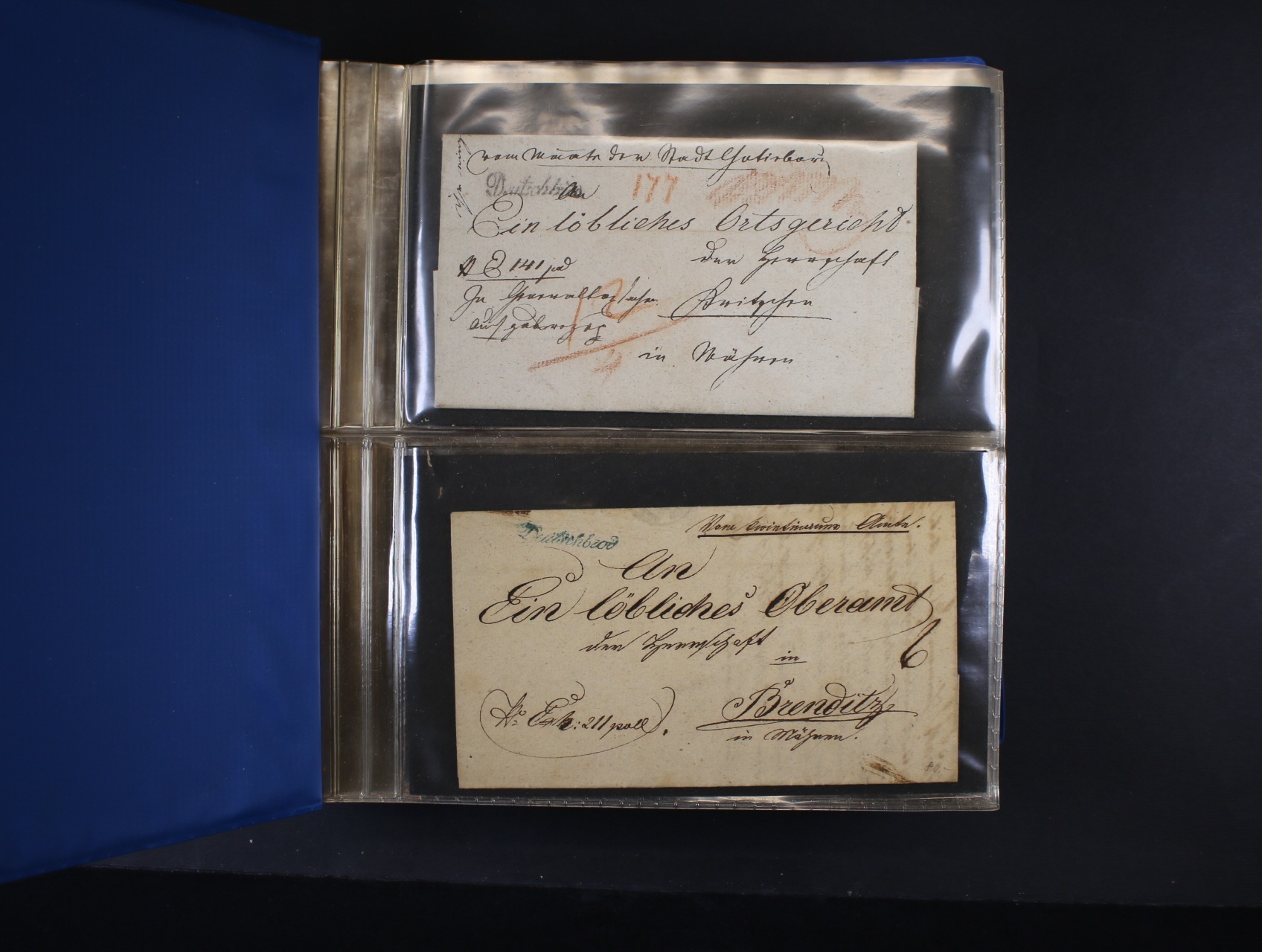 1336 Rakousko-Uhersko - sbírka 31 ks skl. předzn. dopisů, R-dopisů, recepisů s různými raz. DEUTSCHE BROD v barvě černé, modré a různá přídavná raz. v barvě červené z let 1825 - 1850 + 45 ks různých celistvostí s různými raz. + EX OFFO až do r. 1900, zajímavé, k prohlédnutí, uloženo v plastových listech v mechanických deskách 3000