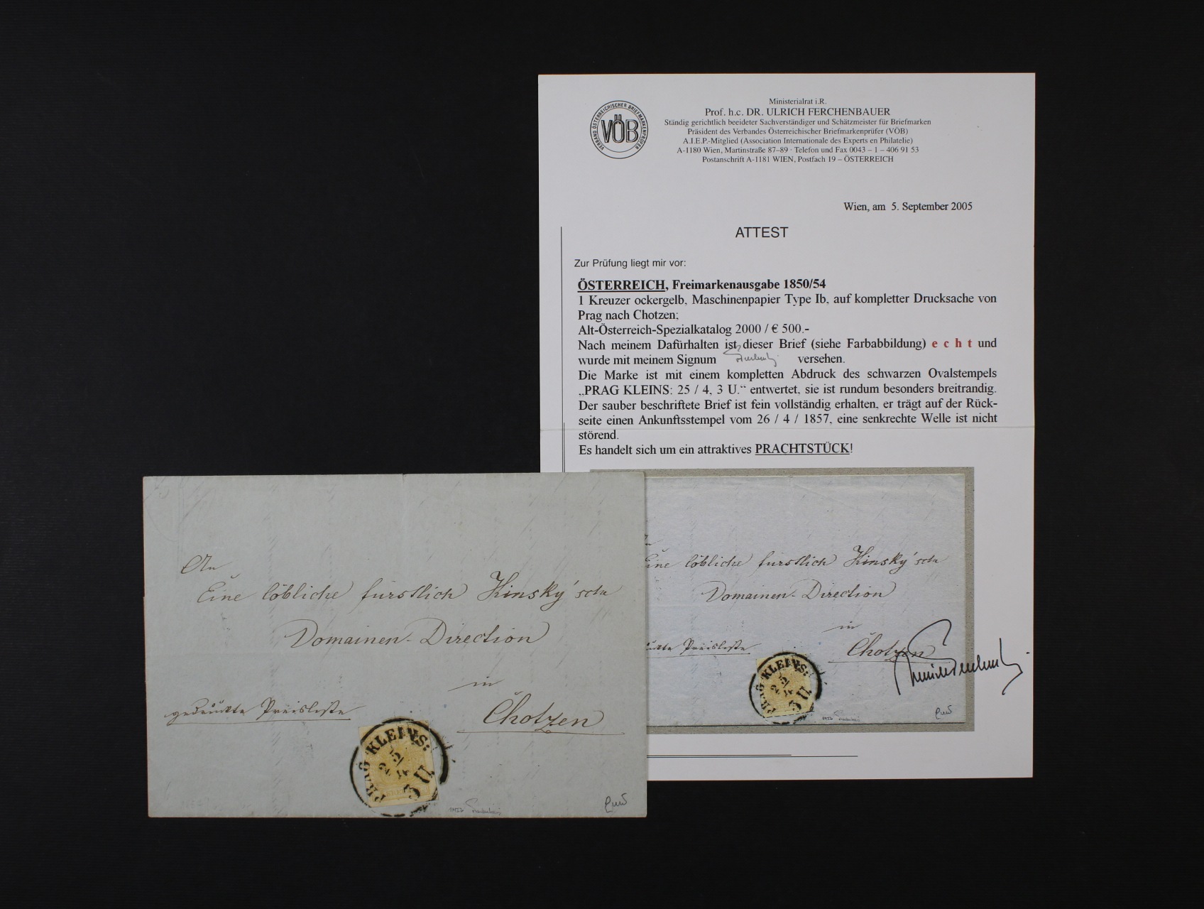 skl. tiskopis do Chocně z r. 1857 frank. zn. Fe. č. 1, typ Ib MP, pod. oválné raz. PRAG KLEINS 25.4. 3 U. + přích. raz., zk. a atest Ferchenbauer, 500 EUR