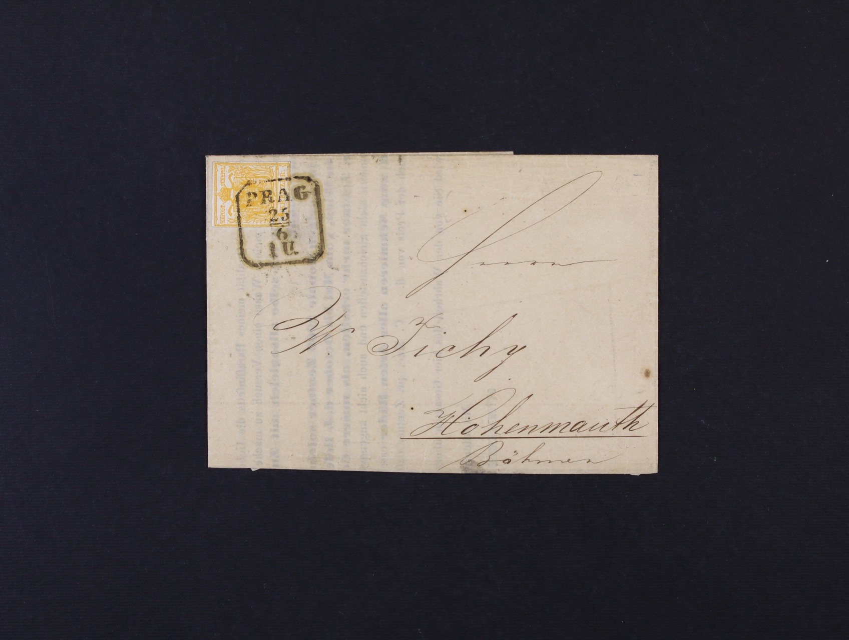 skl. dopis z r. 1855 do Vysokého Mýta, frank. zn. Fe. č. 1 HP oranžová s tzv. "Liliputschnidt" s rámeč. raz. PRAHA 25.6.1 U. + přích. raz. HOHENMAUTH 25.6.
