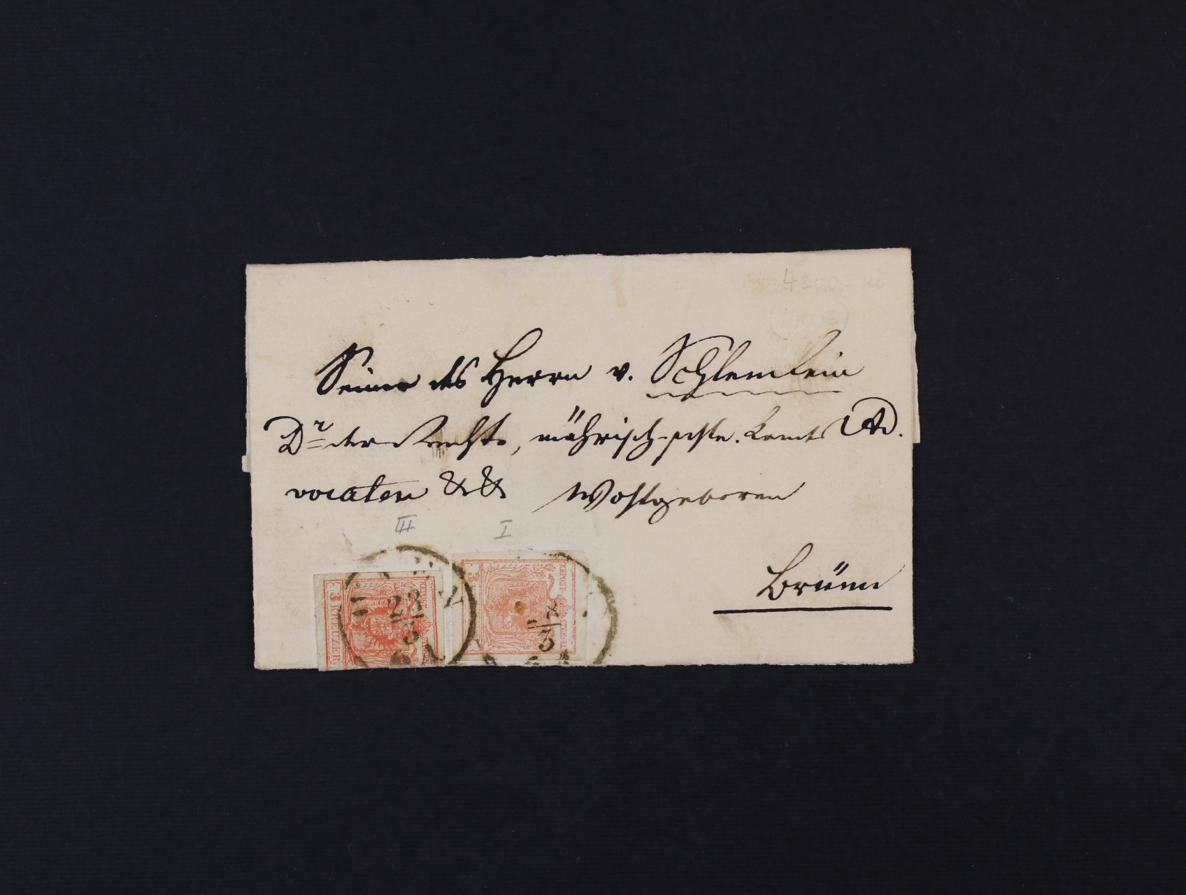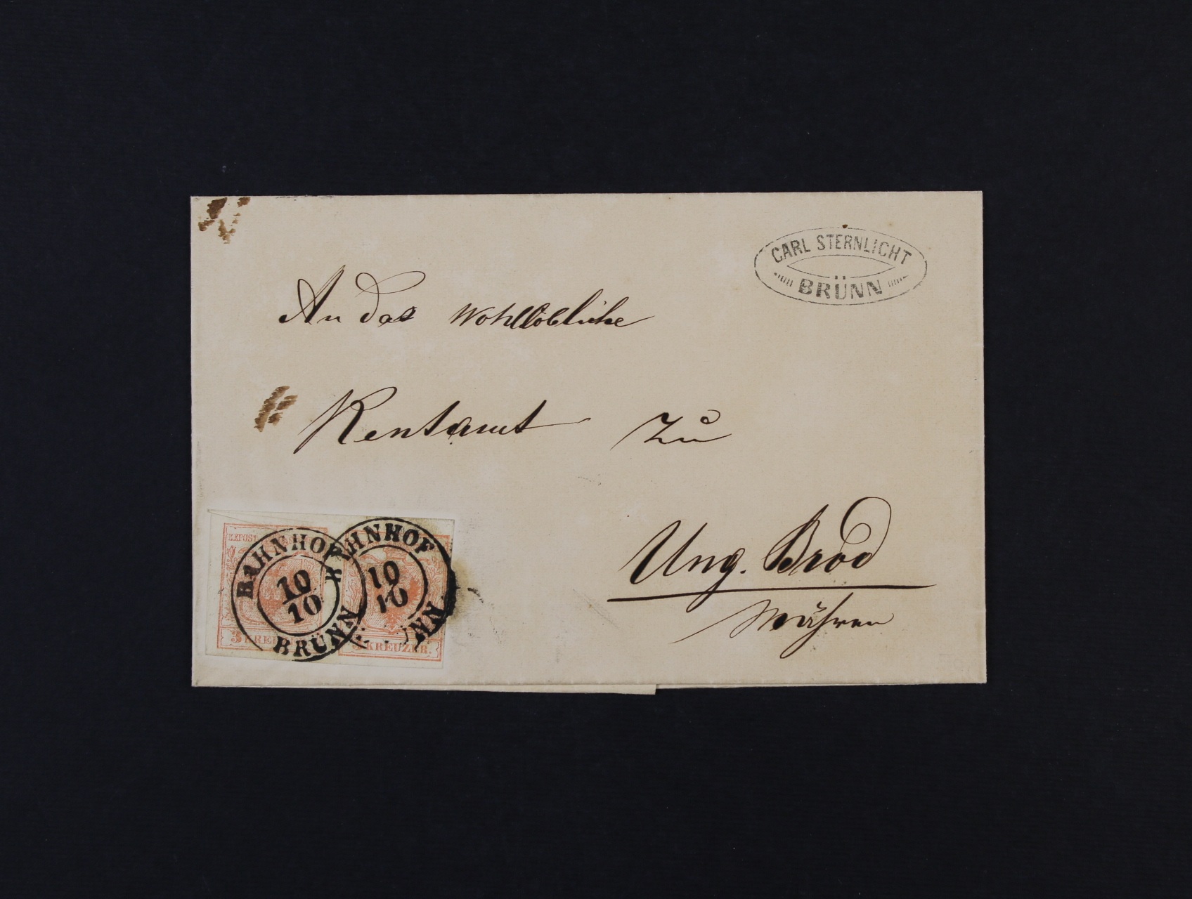 skl. firemní dopis do Uherského Brodu frank. dvoupáskou zn. Fe. č. 3 s gravurou, při oddělování zn. poštmistrem nastřiženo šikmo v horní části před nalepením na dopis, pod. dvoukruh. raz. BAHNHOF BRÜNN 10.10. + průch. raz. LUNDENBURG a přích. raz. UH. BROD 11.OCT.