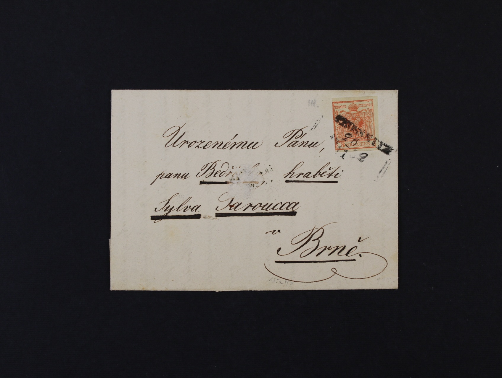 neúplný skl. dopis z r. 1852 do Brna, psaný v českém jazyce, frank. zn. Fe. 3, typ III, pod. řádkové raz. PROSNITZ 26.11.1852 + přích. raz. BRÜNN 27. NOV., velmi zajímavé