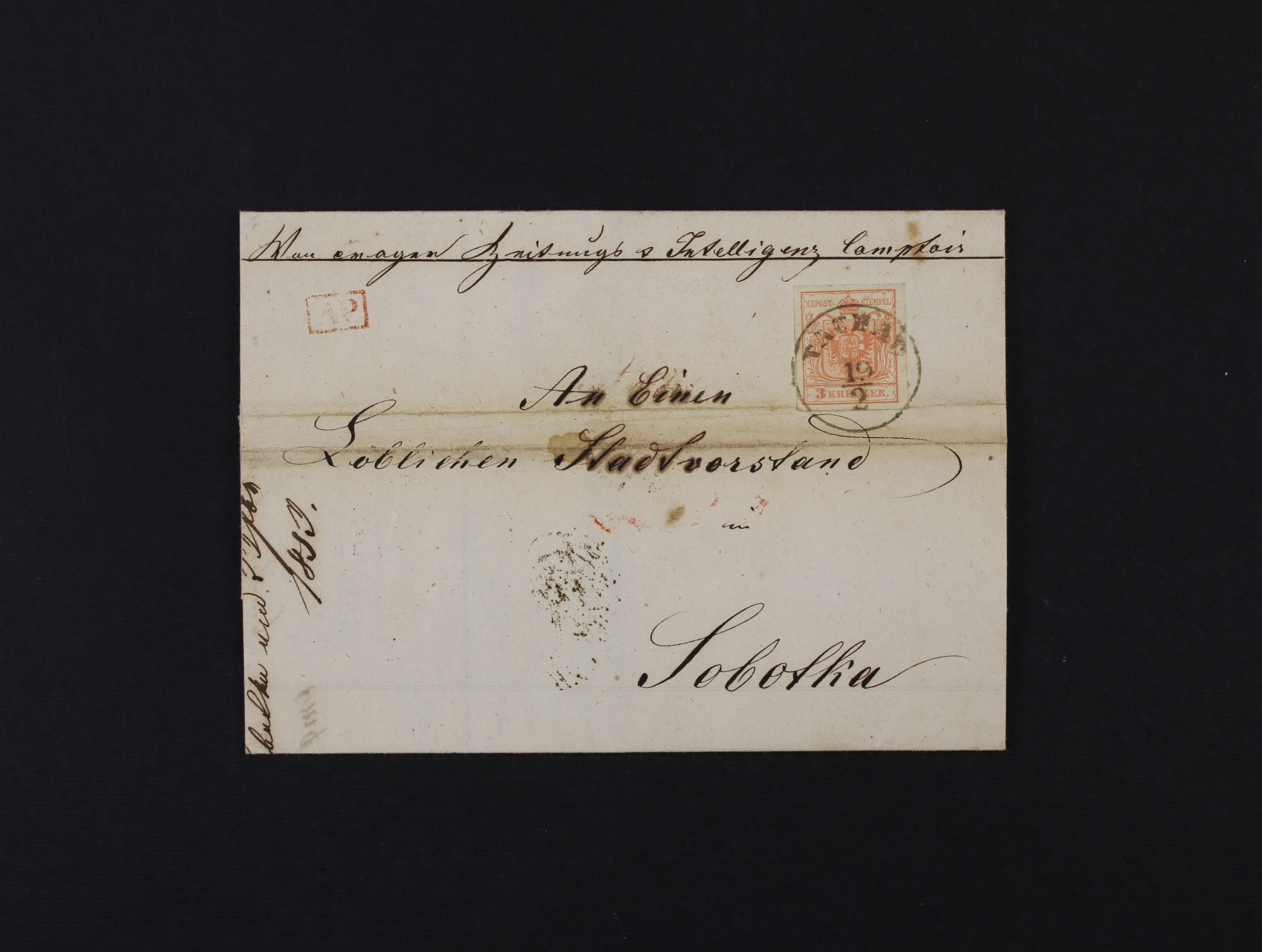 skl. dopis (firemní faktura) z 1852 do Sobotky frank. Fe č. 3 Hp typ 3, jednokruhové pod. razítko Tachau 19. 2. + přídavné rámečkové červ. razítko AP a průchozí raz. Prag 21 FEB, vodorovně mimo zn. registrační lom