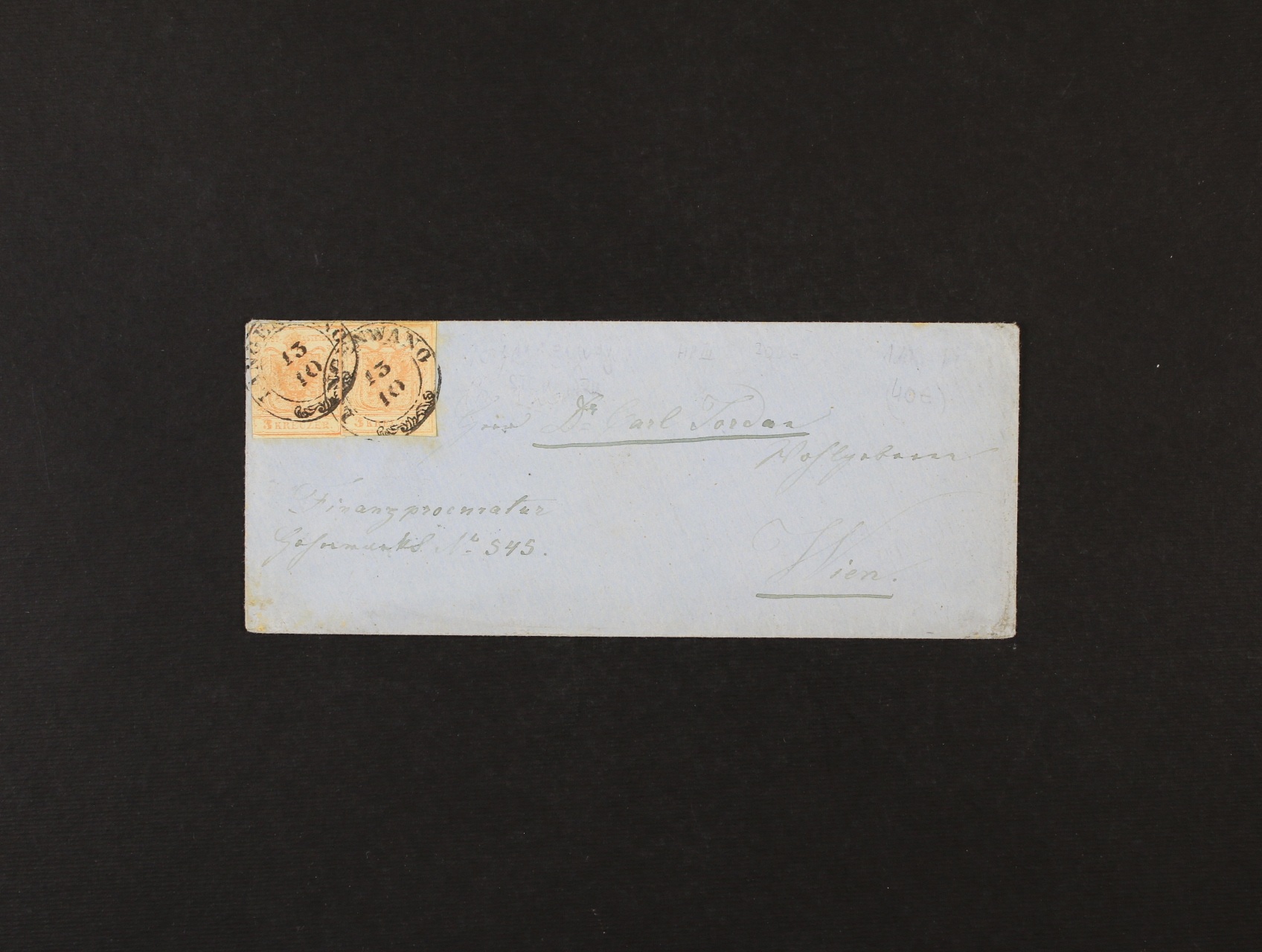 dopis malého formátu do Vídně frank. zn. Fe. č. 3 HP, typ III, (2x), tzv "Liliputschnidt", pod. raz. LANGENWANG 13.10., přích. raz. WIEN , zajímavé