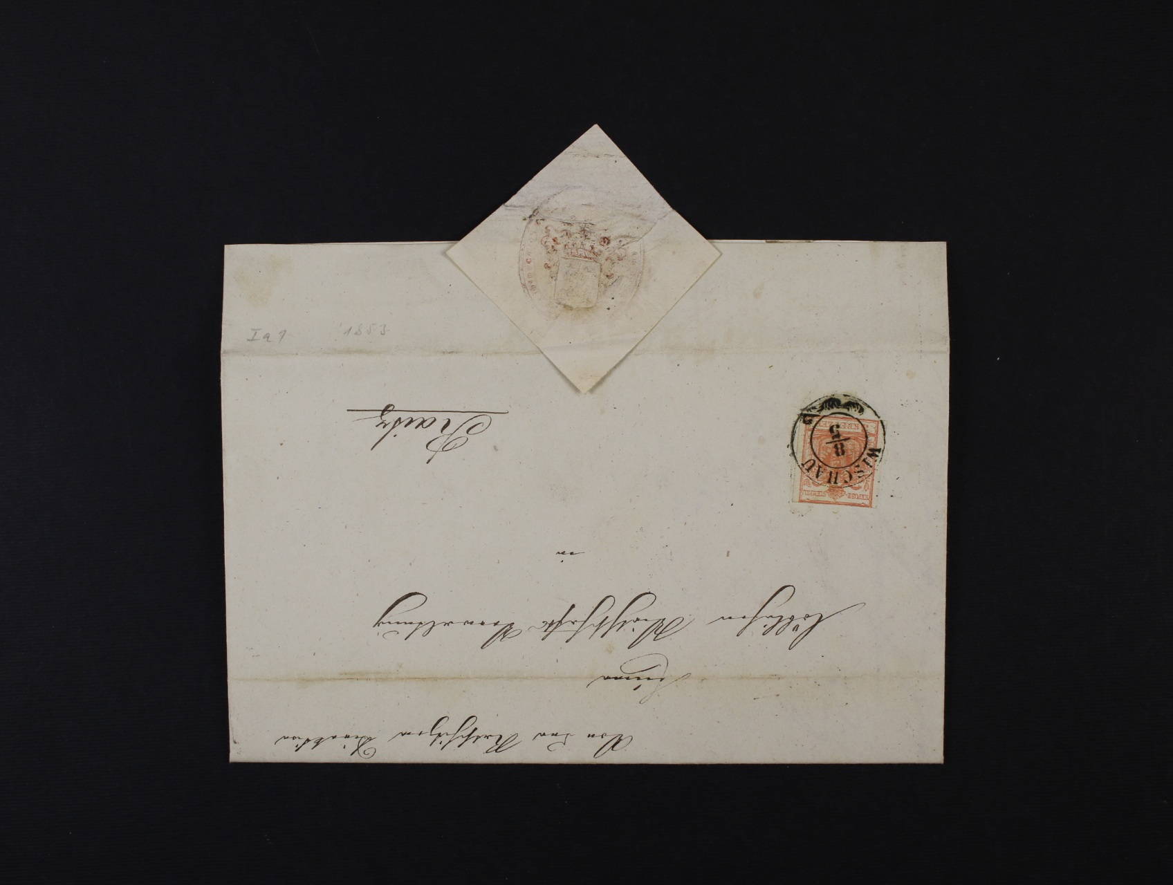 skl. dopis do Rájce z r. 1853 frank. zn. Fe. č. 3 HP, typ I, s dvoukruh. pod. raz. WISCHAU 8.5. + průch. raz. BRNO, BLANSKO, neporušená papírová pečeť, zajímavé