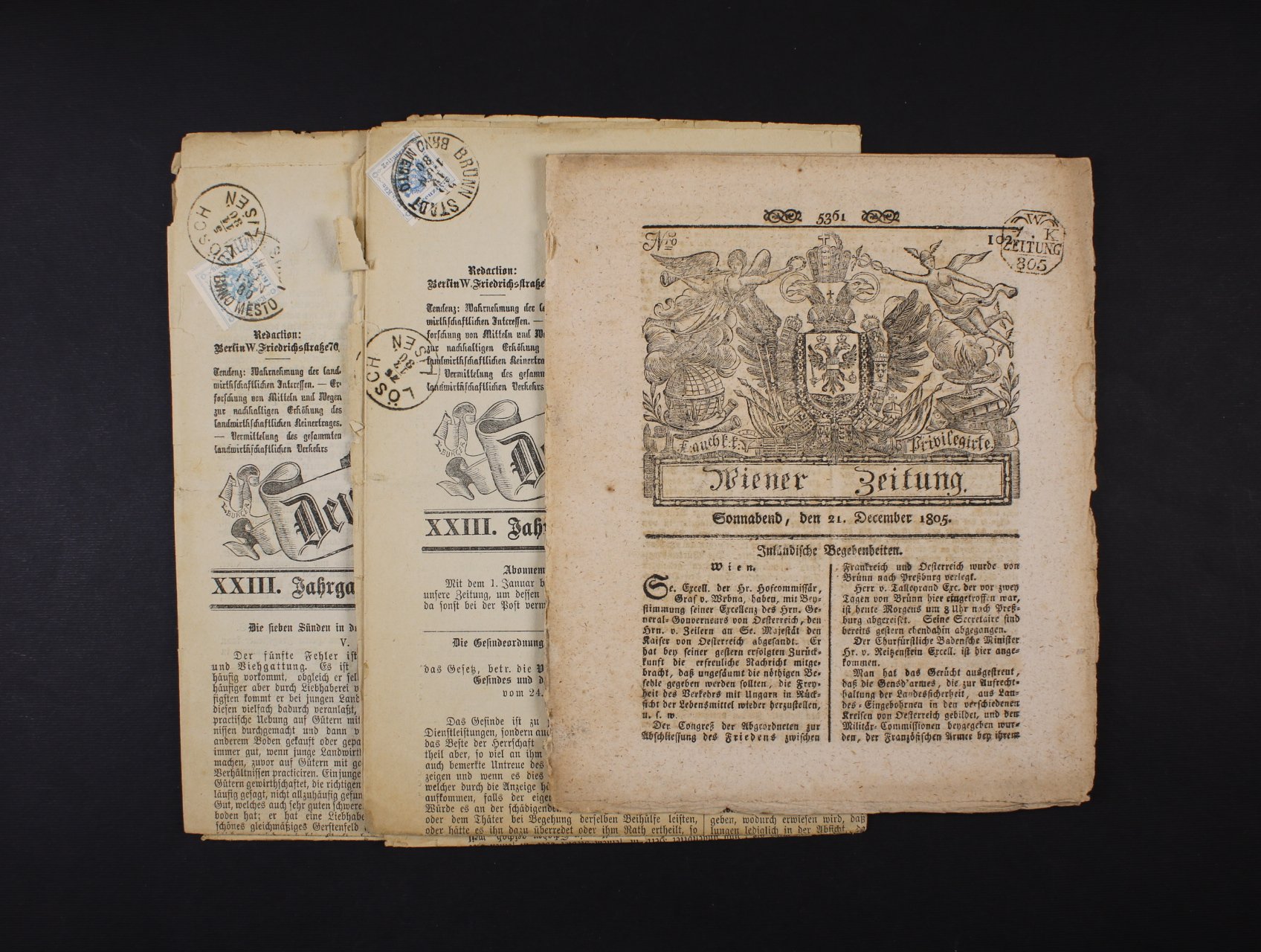 noviny Wiener Zeitung z r. 1805 s novinovou signětou a dvoje noviny Deutsche Landwirthschaftliche Zeitung z r. 1880 frank. novinovou zn. Fe. č. 5 znehodnoc. dvojjazyčným DR BRÜNN STADT 25.12.80 a s přích. dvojjazyčným raz. LÍŠEŇ, resp. s dvojjazyčným raz. BRNO MĚSTO 4.11.80 + přích. raz. LÍŠEŇ, zajímavé