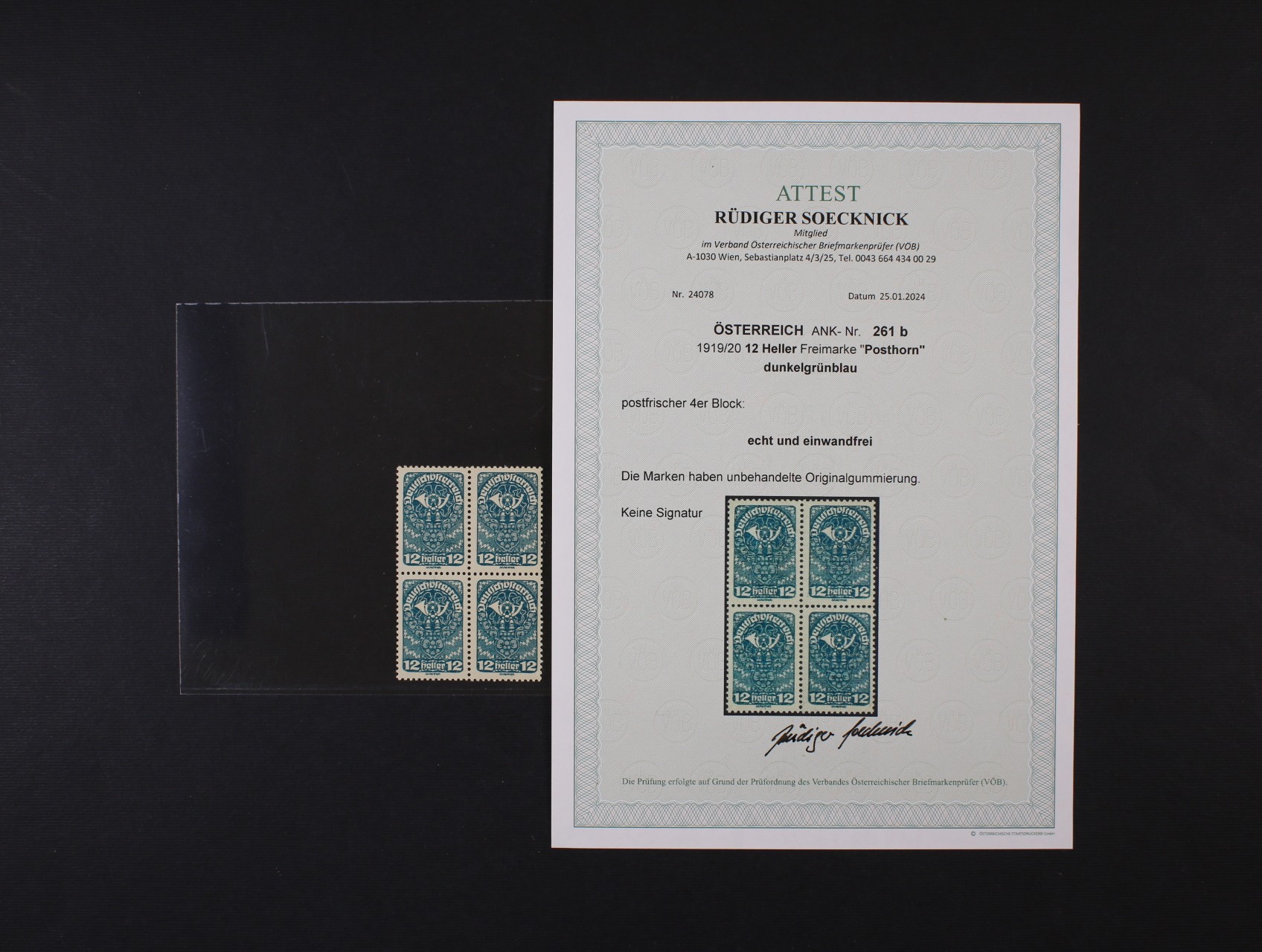 zn. ANK. č. 261b, 4-blok "Posthorn" 12h ve vzácné barvě tmavě zelenomodrá; luxusní kvalita, atest Soecknick, kat. 1.250 EUR