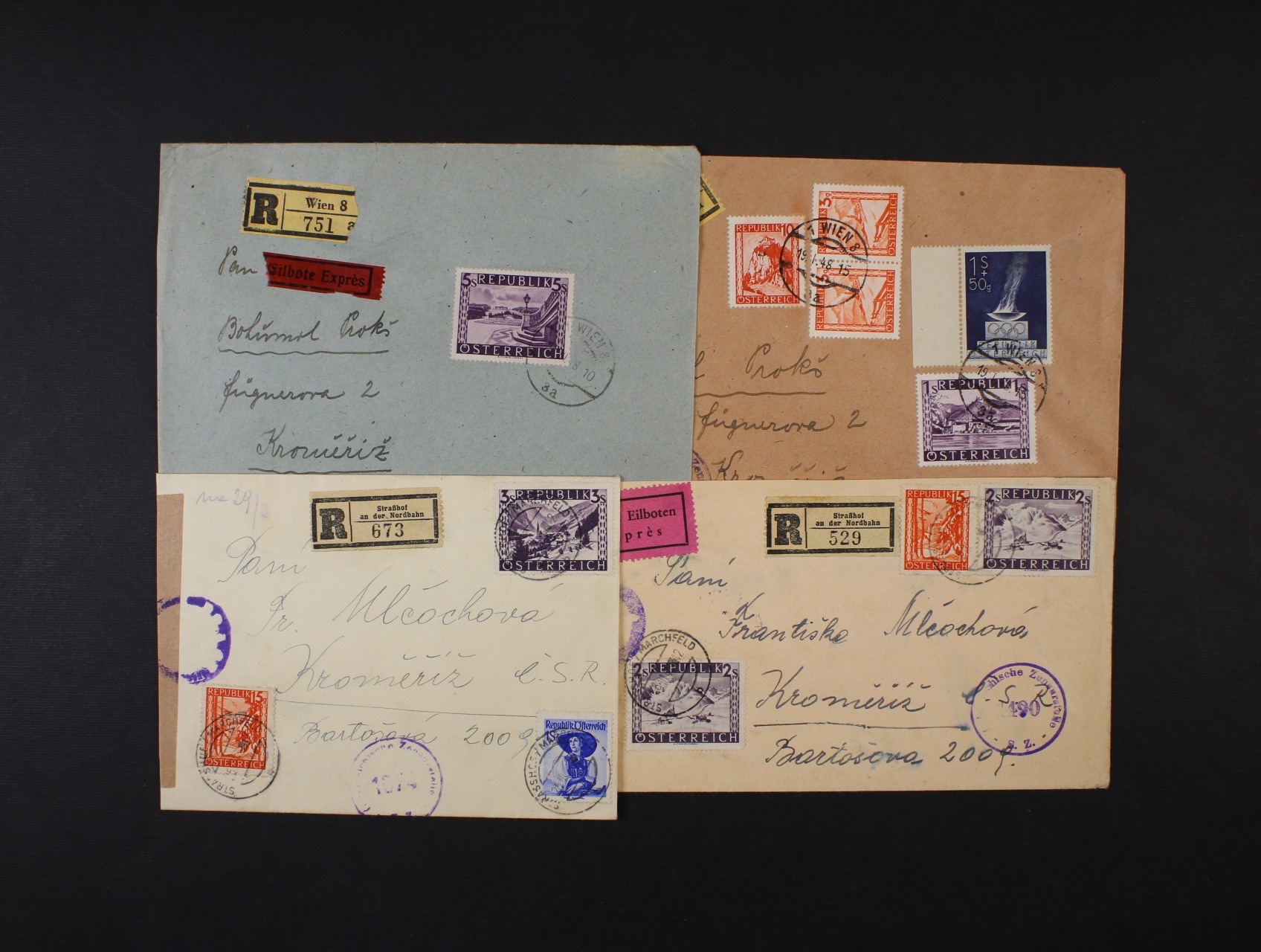 sestava 4 ks dopisů (2x RECO, 2x R-EXPRES) frank mj. zn. Mi. č. 767 - 770, cenzurní pásky a raz., zajímavé
