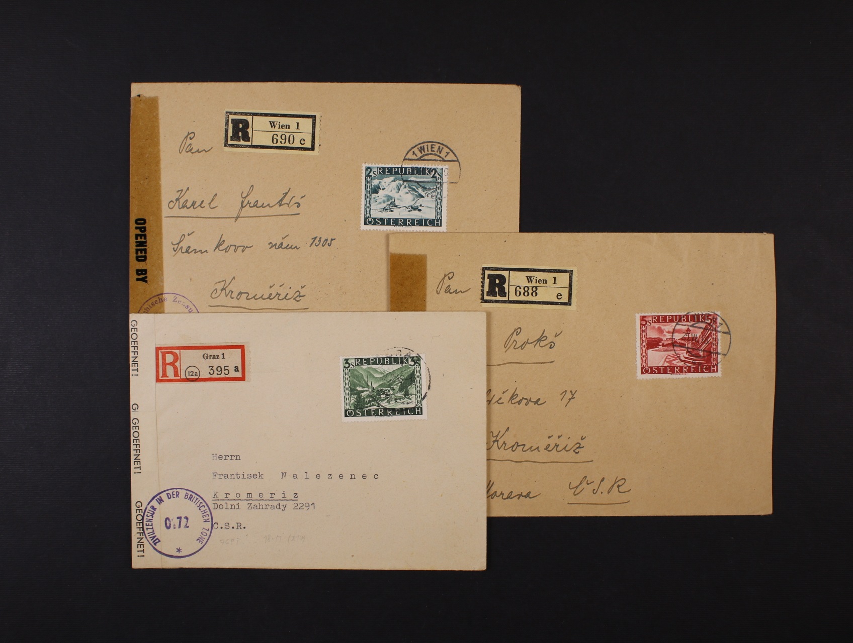 sestava 3 ks R-dopisů do ČSR frank. zn. Mi. č. 768 - 770, cenzurní pásky a raz., přích. raz., zajímavé