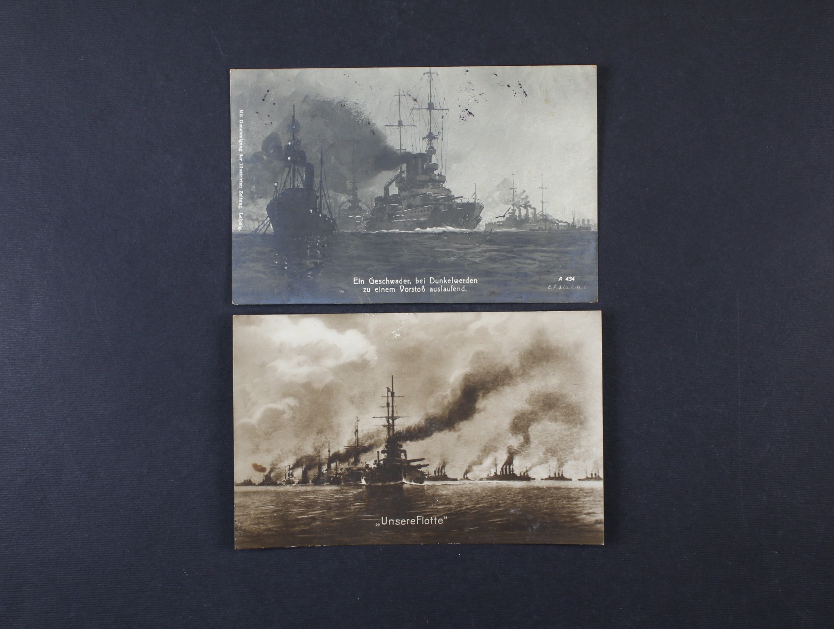 1601 dvě jednobar. fotopohlednice "Unsere Flotte, Výjezd eskadry za tmy", pod. raz. K.u.K. MFPA POLA s modrým, resp. fialovým dvoukruh. raz. S.M.SCHIFF TEGETTHOFF 400