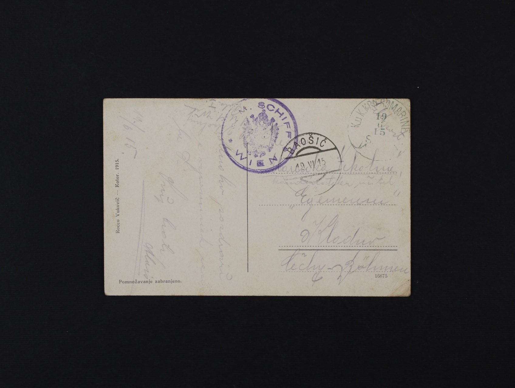 1603 celistvost do Čech s pod. raz. BAOŠIČ 19.4.15 + lodní raz. K.u.K. KRIEGSMARINE S.M.S. WIEN 19.6.15 a palubní kašet S.M.S. SCHIFF WIEN 300