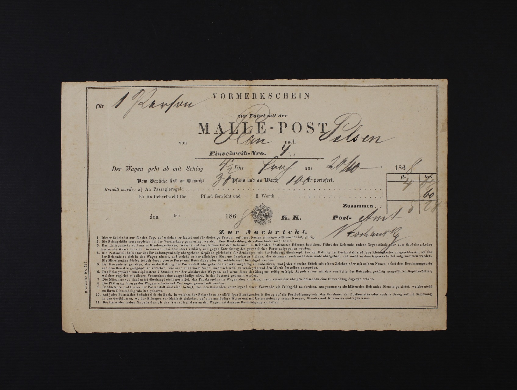 1604 Malle - Post s datací 20.10.1868, uprostřed svisle přeložený 400
