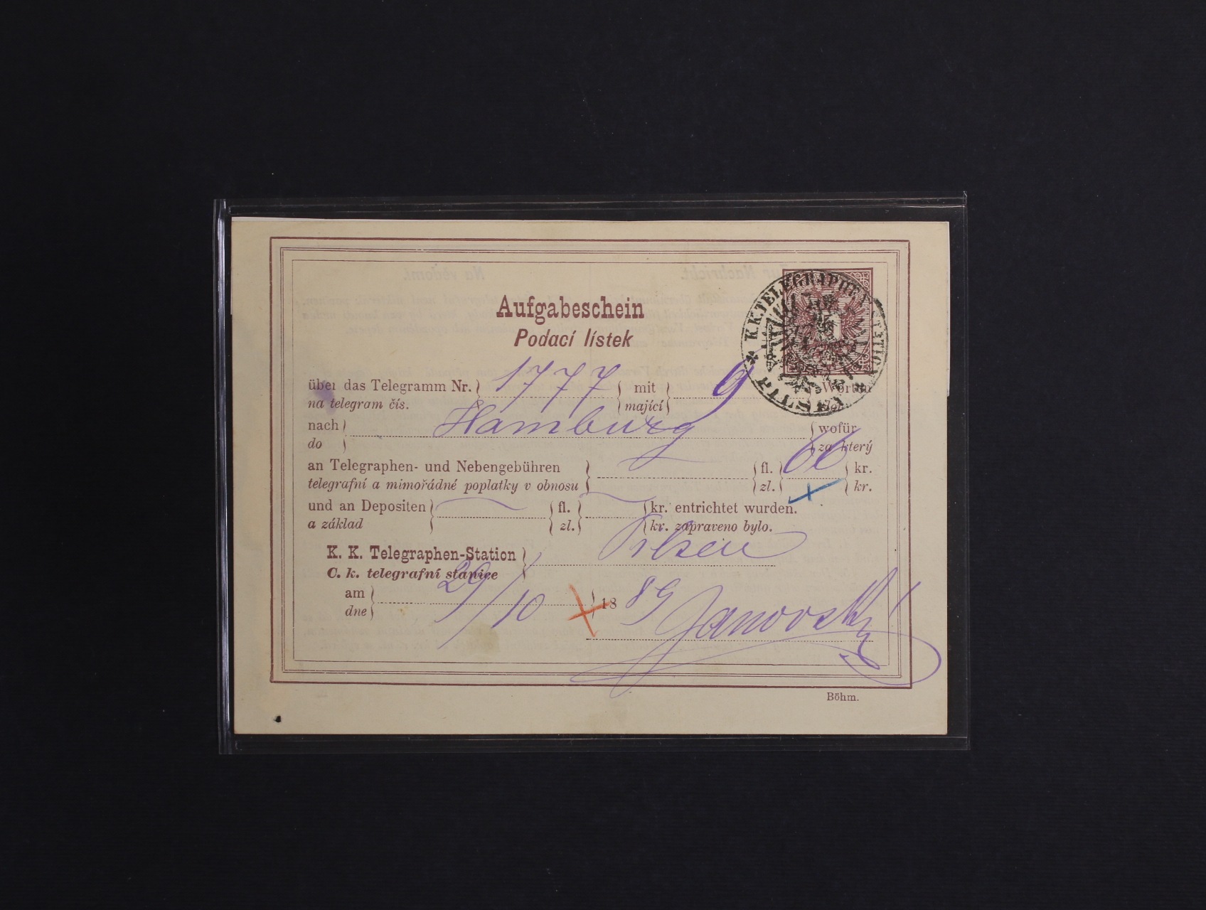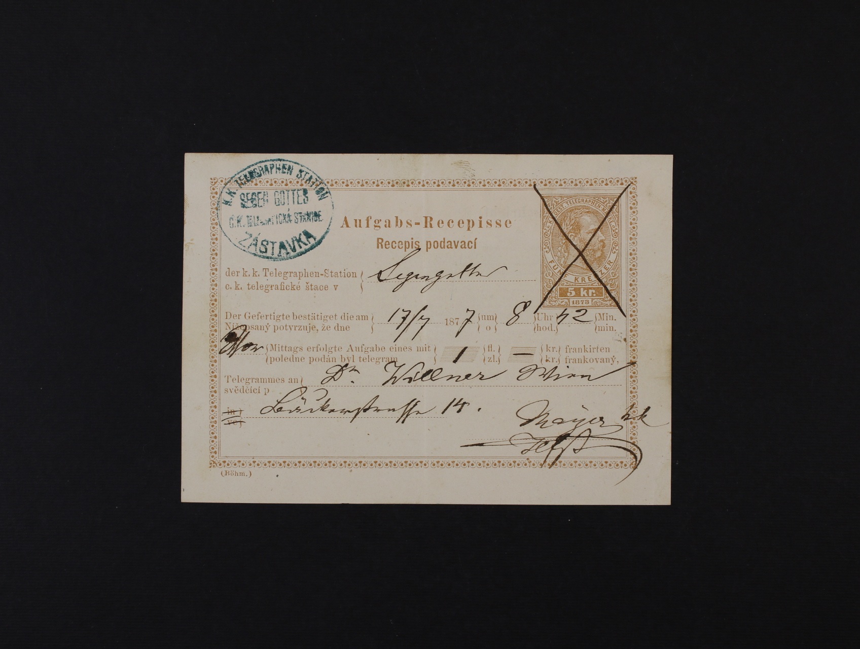 1607 podací recepis 5kr 1873 do Vídně s datací 17.7.1877, znehodnoc. škrtem pera přes zn. a modré dvojjazyčné služ. raz. v levém rohu C.K. TELEGRAFICKÁ STANICE ZASTÁVKA, velmi zajímavé 500