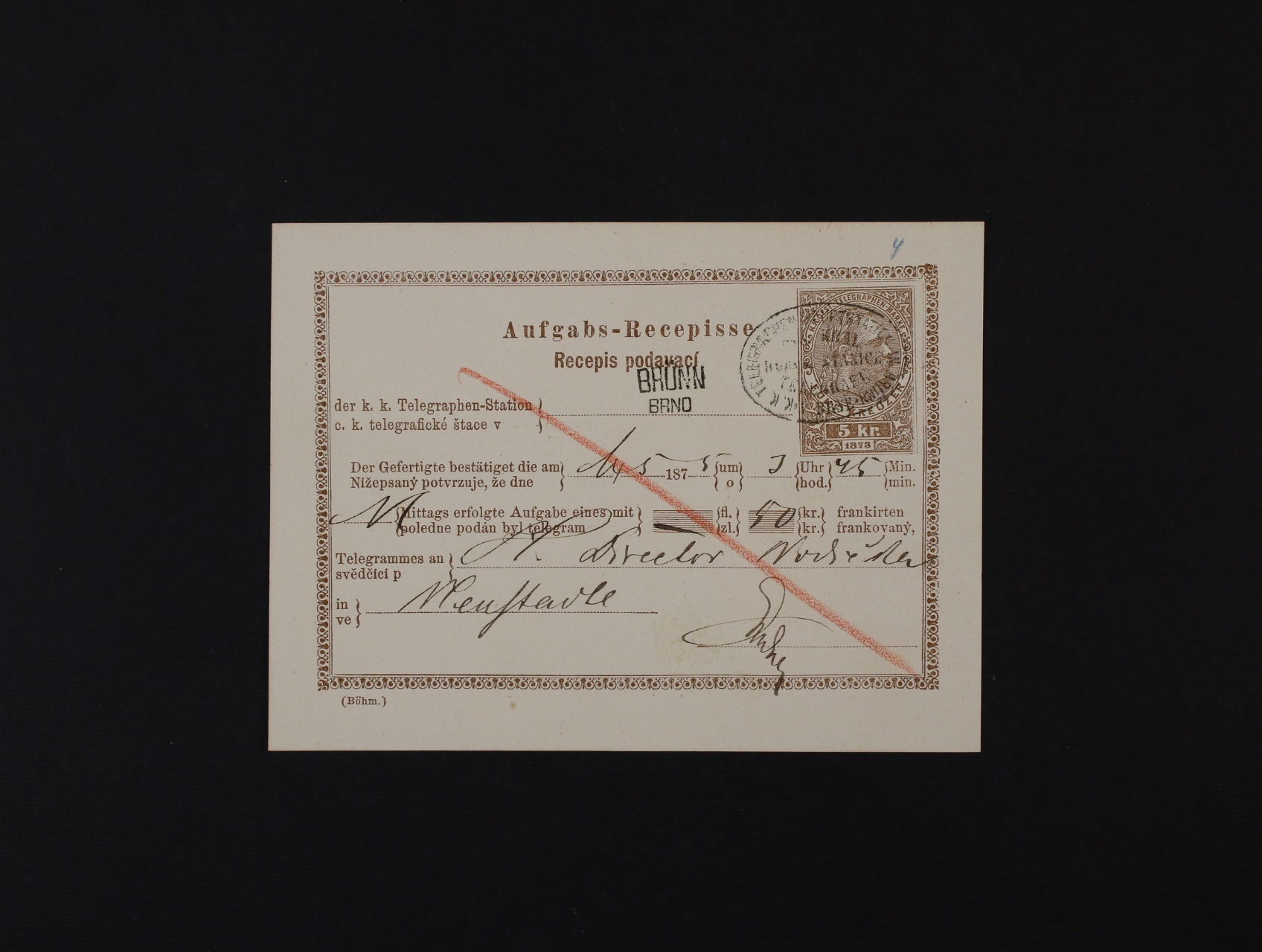 1606 podací recepis 5kr 1873 do Břeclavi v r.1875 , pod. oválné černé dvojjazyčné raz. C.K. TELEGRAFICKÁ STANICE V BRNĚ + černé řádk. raz. BRÜNN BRNO, zajímavé 400