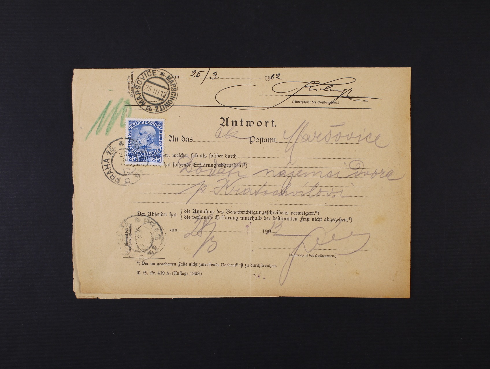 1608 Rückmeldung na odpovědní části frank. zn. vydání 1908 25h F.J. s raz. PRAHA 14 28.3.1912 500