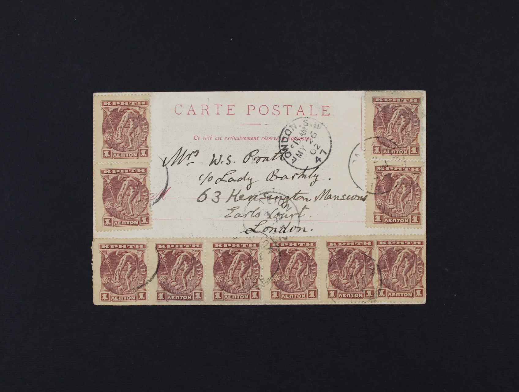 1627 Kreta - jednobar. litograf. pohlednice zaslaná do Londýna, frank. zn. Mi. č. 1 v 5ti-pásce + 5 zn., pod. raz. CANDIA 12.5.1902, přích. raz. LONDON 26.MY.1902 1500