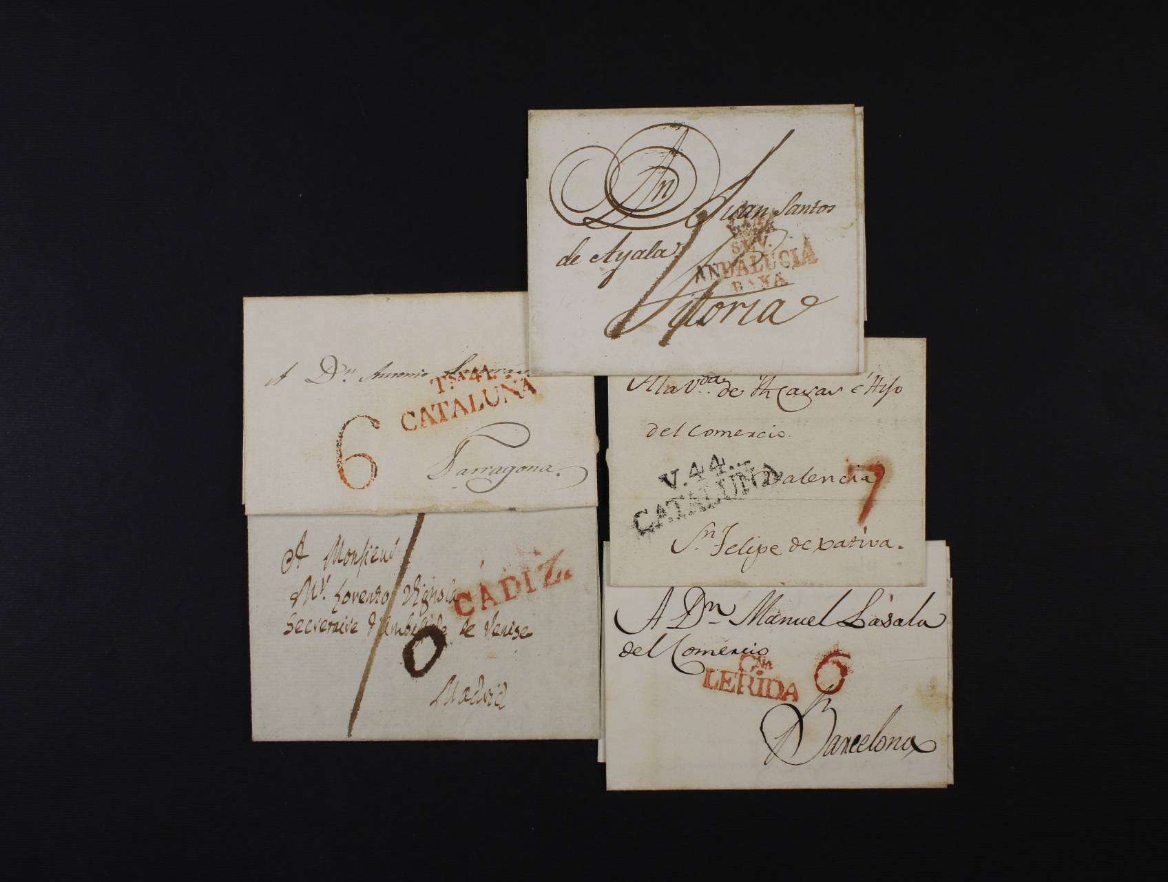 1629 sestava 5 ks skl. předzn. dopisů z období 1787 - 1829, s červeným a černým řádkovým raz. KATALUNA a červenými řádk. raz. CADIZ, LERIDA, ANDALUCIA, zajímavé 1000