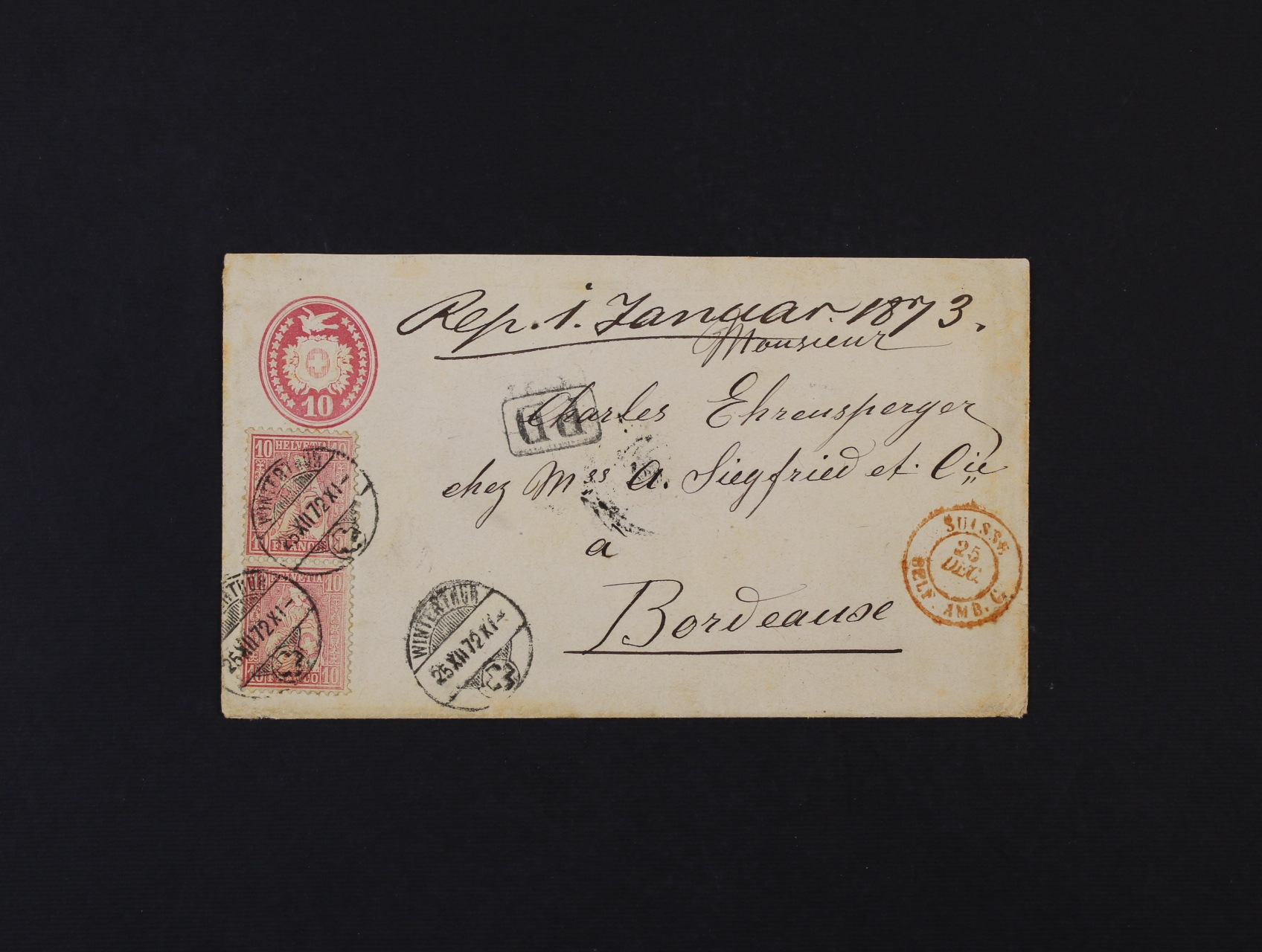 1634 celinová obálka 10c dofrank. svislou dvoupáskou zn. 10c sedící Helvetie, zaslaná do Francie, pod. raz. WINTERTHUR 25.12.72 + červené průch. raz. a přích. raz. PARIS A BORDEAUX 26.DEC.72, dobrá kvalita, zajímavé 500