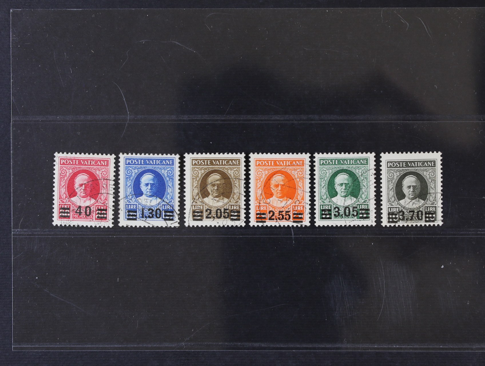 1636 zn. Mi. č. 39-44, Pius XI., přetiskové 40c - 3,70L; bezvadné, zk. Diena a Thaler, kat. 1.200 EUR , razítkované jsou výrazně vzácnější, než "čisté" 4800