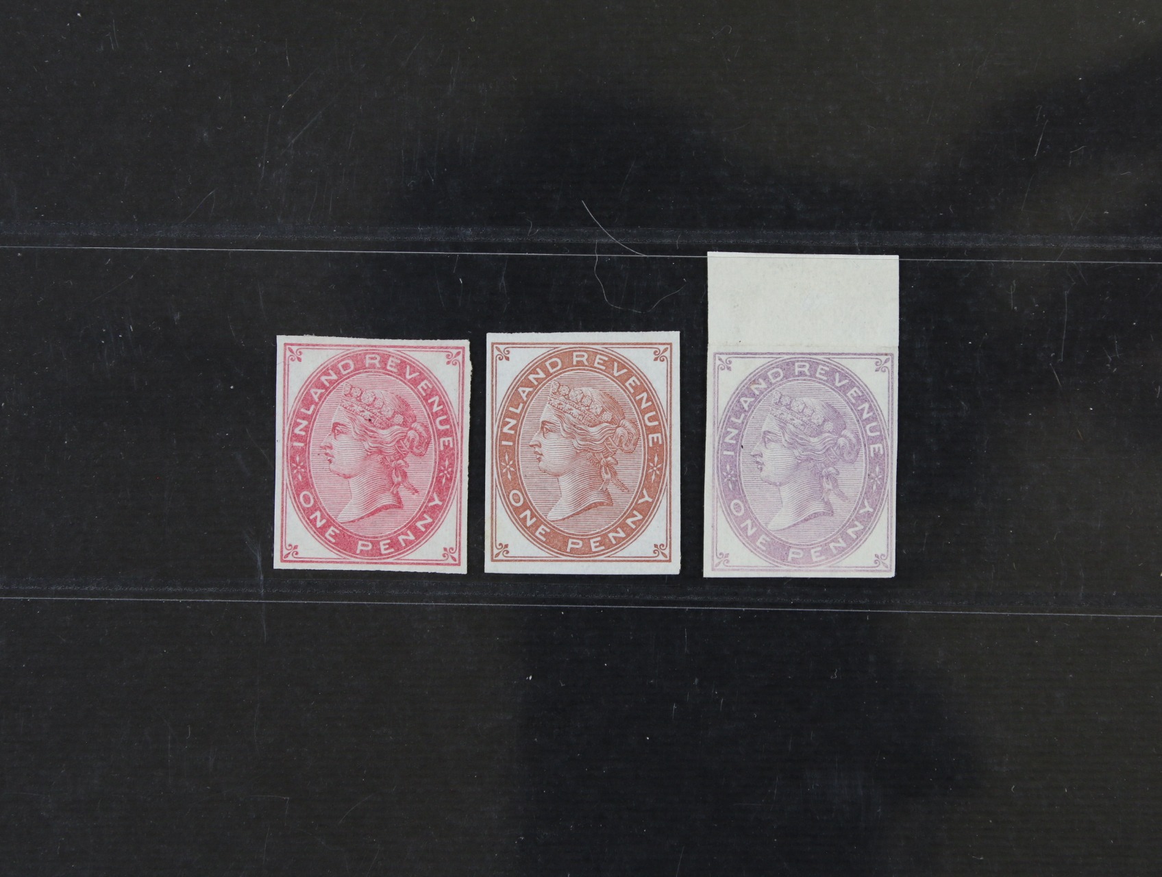 1877 zn. SG. č. F21, Poštovně fiskální INLAND REVENUE / 1P fialová krajová NEZOUBKOVANÁ bez lepu a navíc 2x „Colour Trials“, karmínová a světle hnědá; bezvadné, kat. SG. Spezial 800 GBP, ojedinělý výskyt