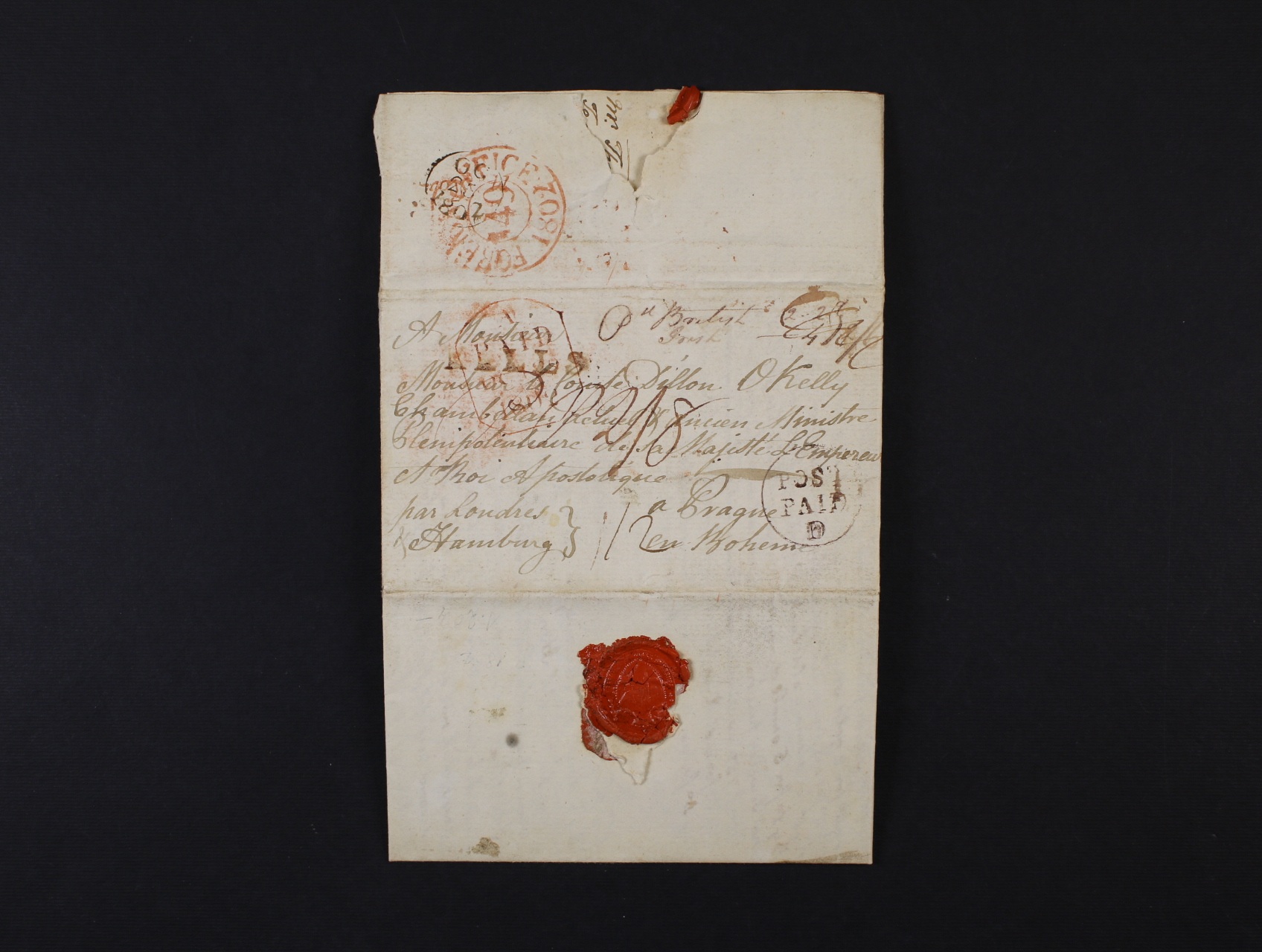 skl. dopis z r. 1802 do Prahy se zdvořilostní adresou, pod. řádkové raz. KELLS + denní červené raz. FOREN... OFICE 149 1802 + červené rámeč. a černé jednokruh. raz. POST PAID