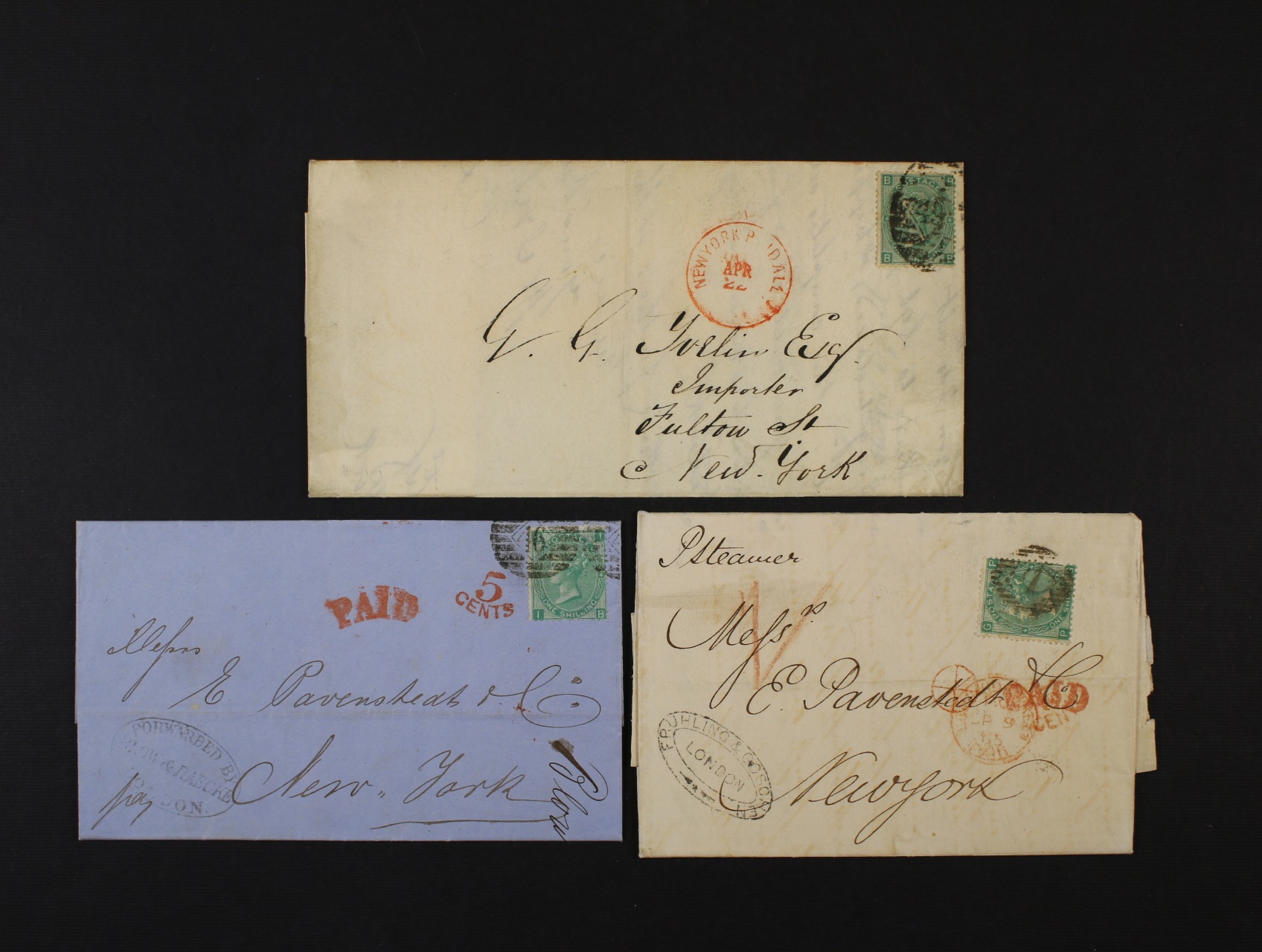 1868 3 dopisy do New Yorku, vyfr. zn. SG. č.100, 101, 117; 1Sh tmavě zelená, 1Sh zelená a 1Sh zelená s novou průsvitkou "Spray of rose"; bezvadné, 1x bez vyznačení US tarifu 5 CENTS, ale nově se vzácným razítkem NEW YORK / PAID ALL; bezvadné dopisy, kat. min. 1.050 GBP