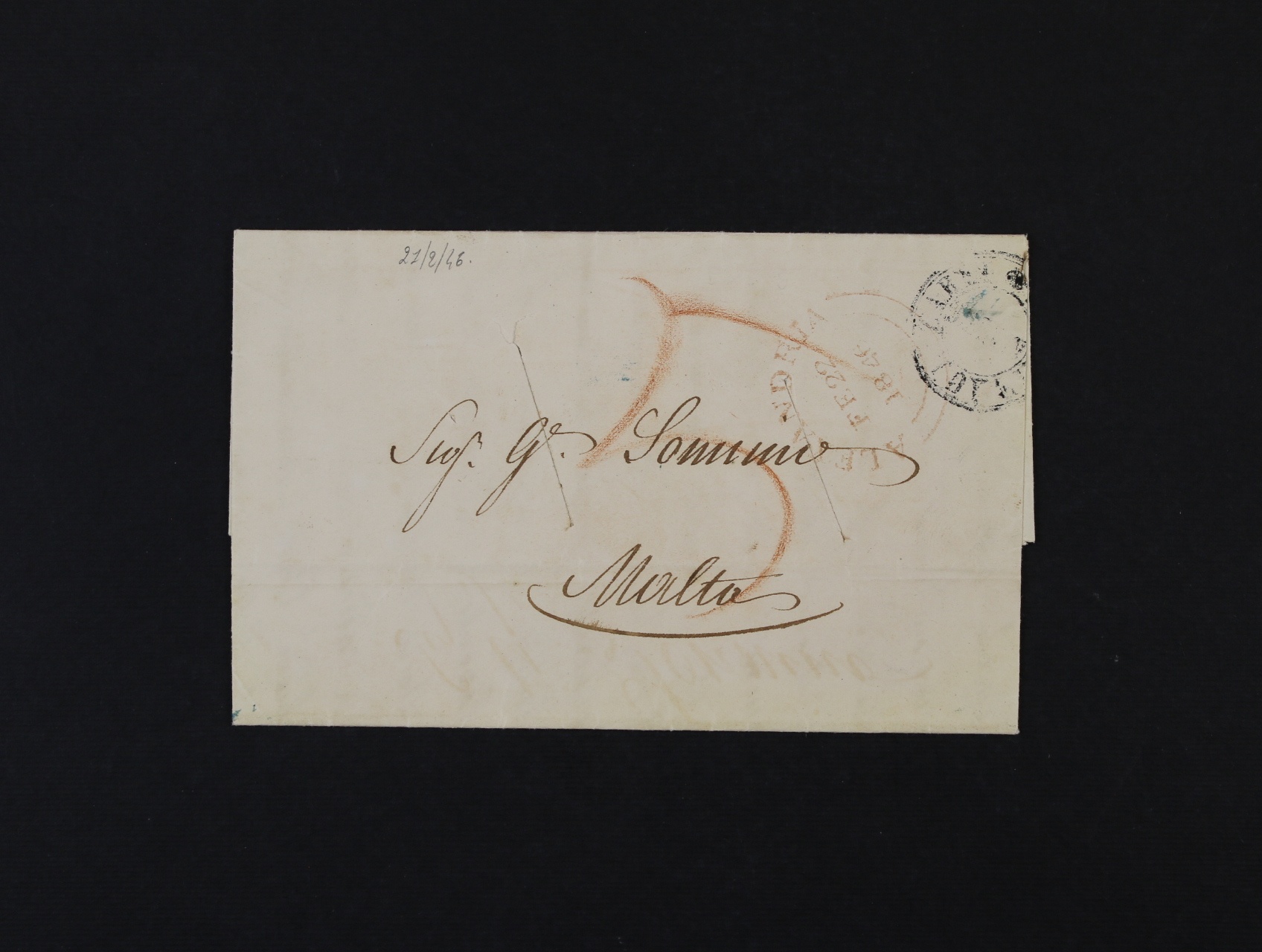pošta v Egyptě - CHOLEROVÝ DOPIS/ ALEXANDRIA "cholerový" dopis (počátek tzv. asijské pandemie 1846-1863), odeslán z britského poštovního úřadu, červené DR ALEXANDRIA FE22 1846, zasláno na Maltu, porto 5C