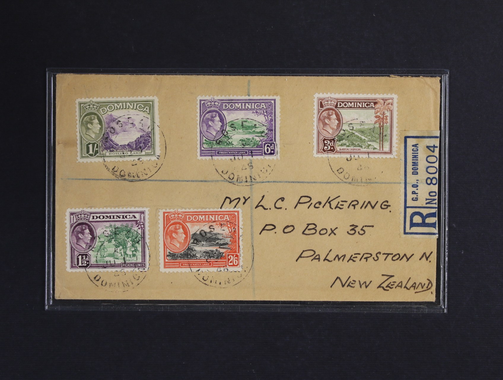 Dominica - R-dopis na Nový Zéland frank. pestrou vysokou frankaturou, pod. raz. DOMINICA JULI.1.46, průch. raz. SAN FRANCISCO 4.JUN.46, přích. raz