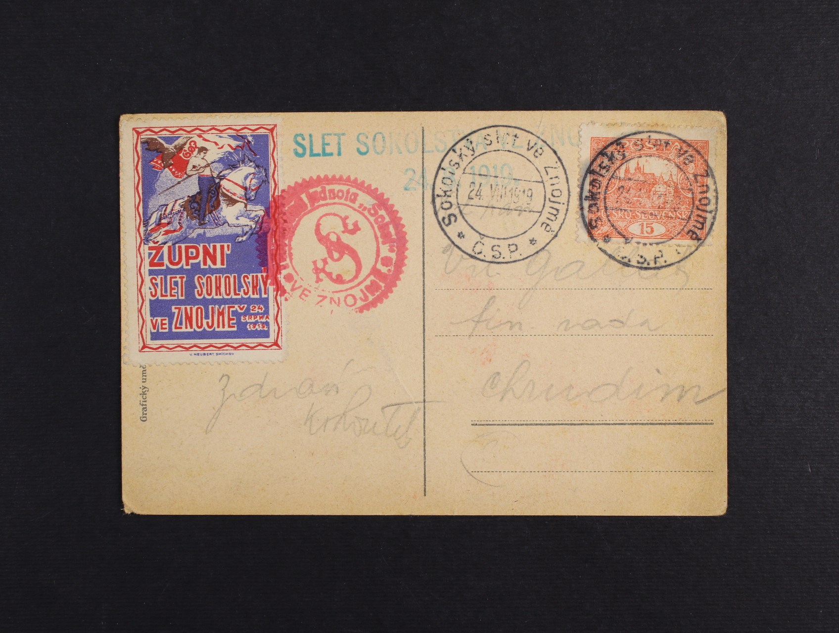bar. pohlednice ŽUPNÍ SLET SOKOLSKÝ VE ZNOJMĚ 3. SRPNA 1919 frank. zn. 15h Hradčany znehodnoc. prvním pam. raz. ČSR ! SOKOLSKÝ SLET VE ZNOJMĚ 24.8.19 + stejné zelené řádkové raz., navíc nálepka župního sletu s červeným raz. Jednota "sokolská" VE ZNOJMĚ, dobrá kvalita