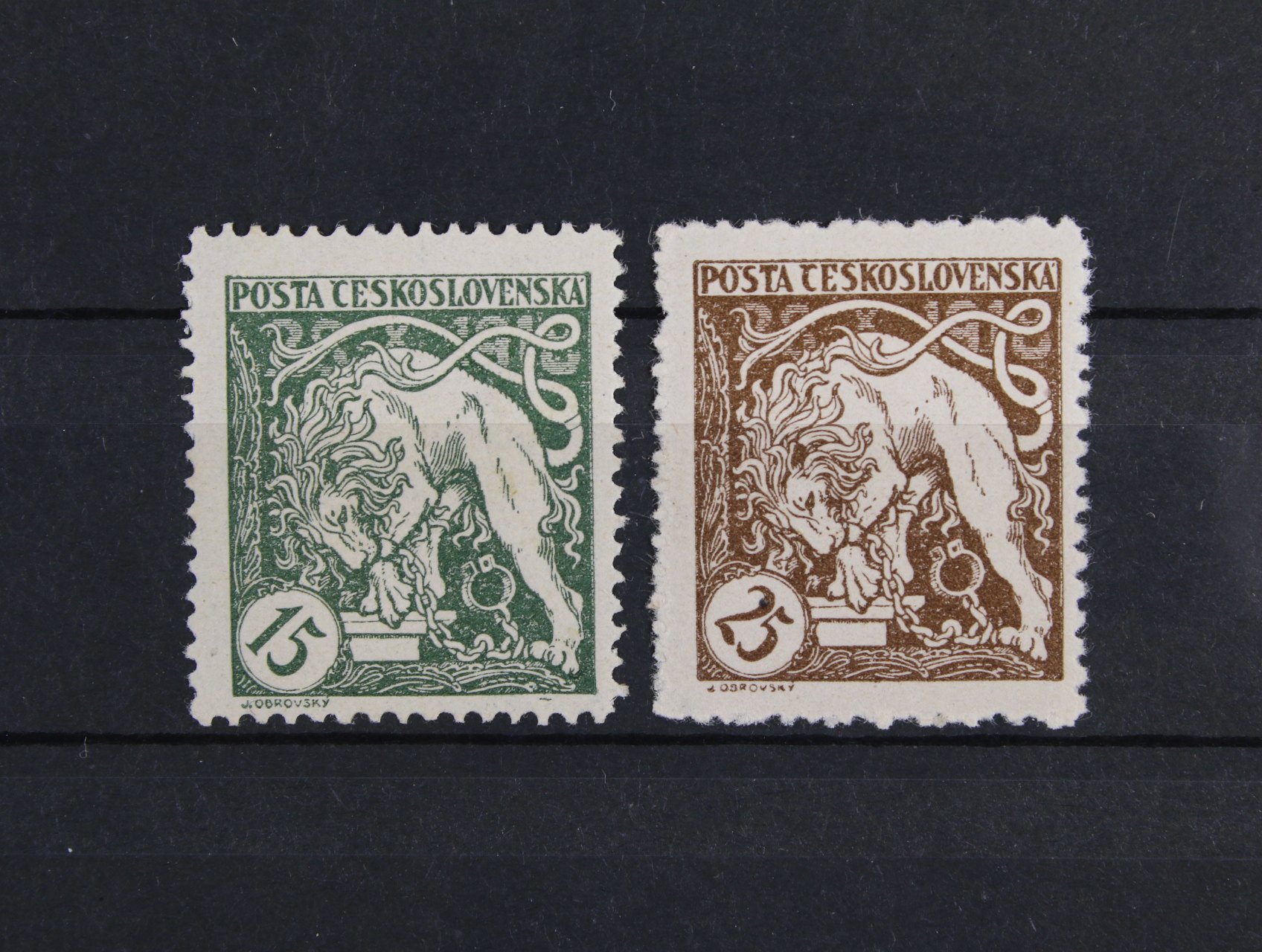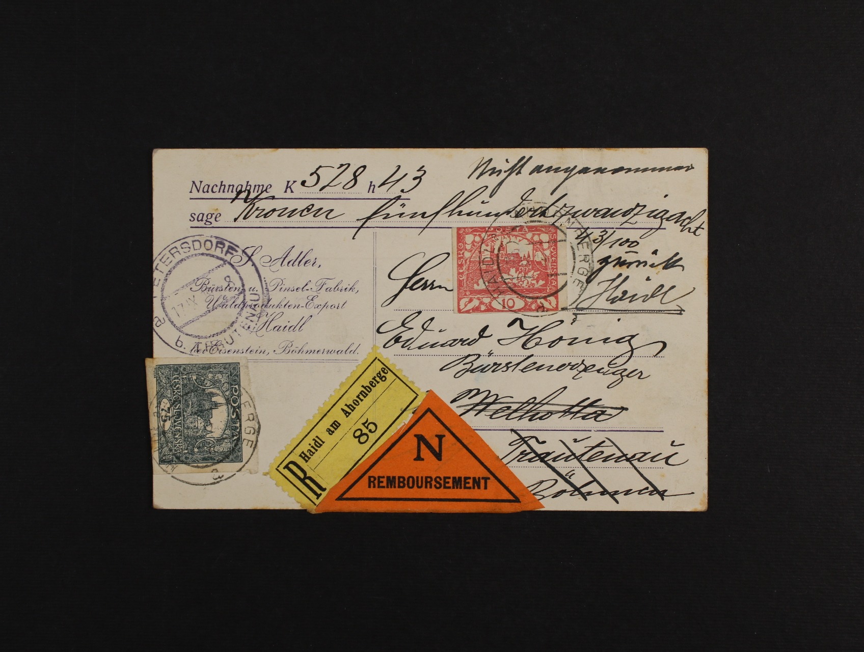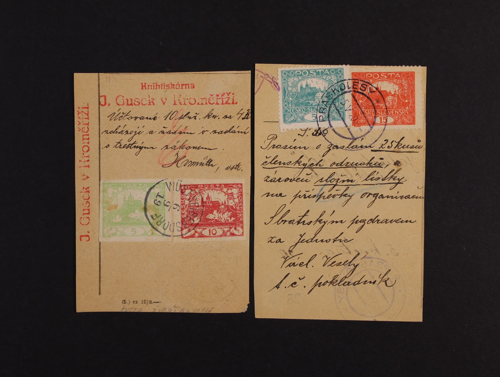 složenka Pošt. spořitelny v Praze se sdělením na zadní str., frank. zn. 5 + 15h s raz. PRASKOLESY 5.5.20, část složenky se sdělením na zadní str. frank. zn. č. 3 a 5 s jednokruh. raz. WÜSTSEIBERSDORF 6.9.19, zajímavé