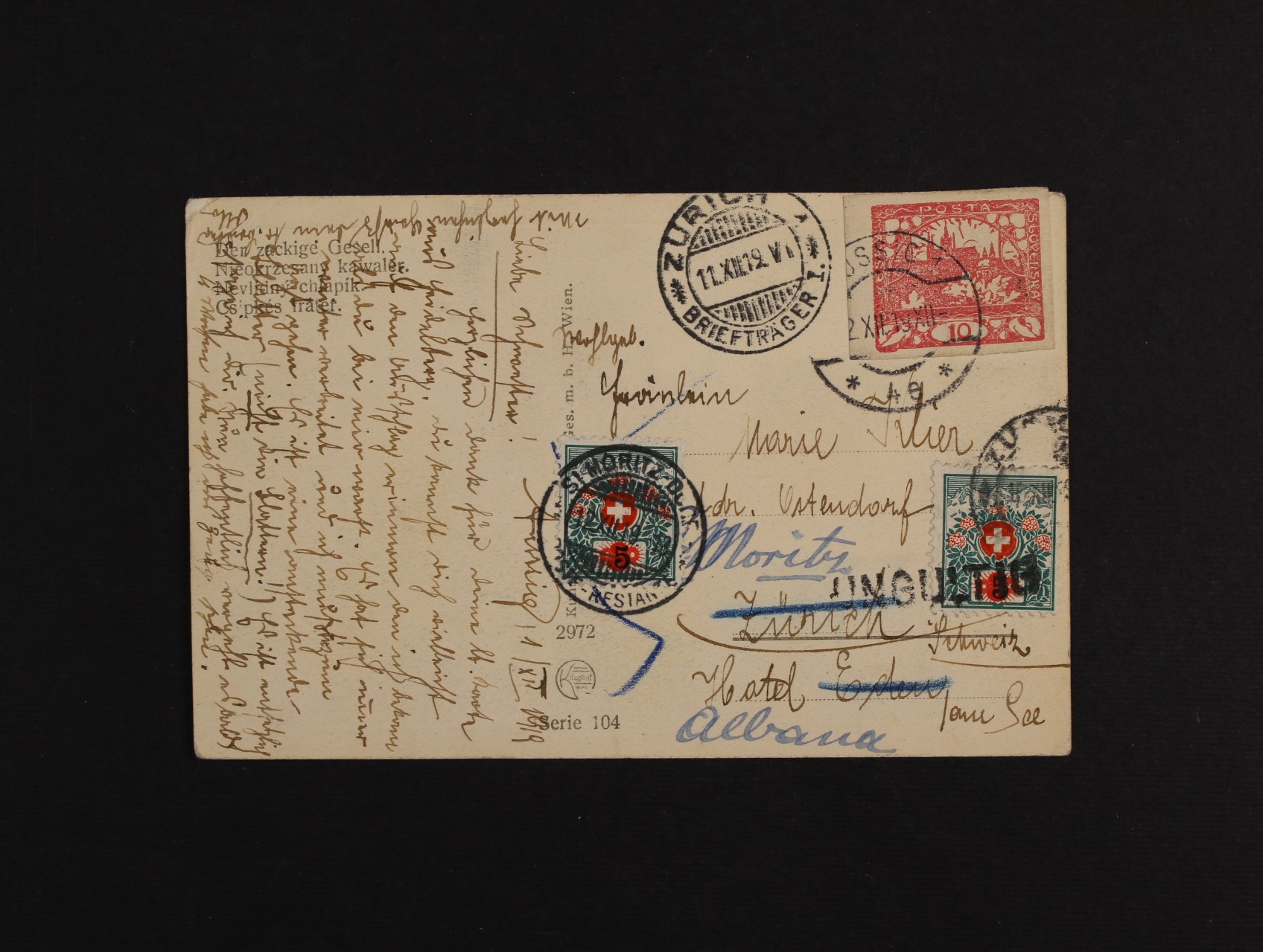 celistvost do Zürichu frank. zn. č. 5, pod. raz. AUSIG 1 2.12.19, v Zürichu zatížen dopl. zn. 5rap. znehodnoc. raz. ZÜRICH 11.12.19 a dosláno na novou adr. Albana s vybraným poplatkem 5rap. znehodnoc. raz. ST. MORITZ 12.12.19