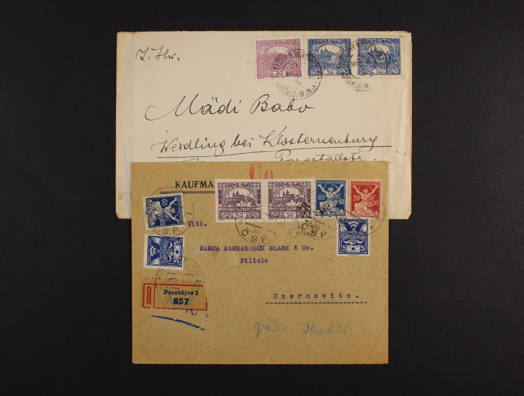 R-dopis do Rumunska frank. smíš. frankaturou Hradčany, Holubice a OR, pod. raz. PROSTĚJOV 21.12.20 a dopis do Rakouska frank. zn. č. 13 B a dvoupáskou zn. č. 16, pod. raz. VÍTKOVICE ŽELEZÁRNY 8.3.20, zajímavé