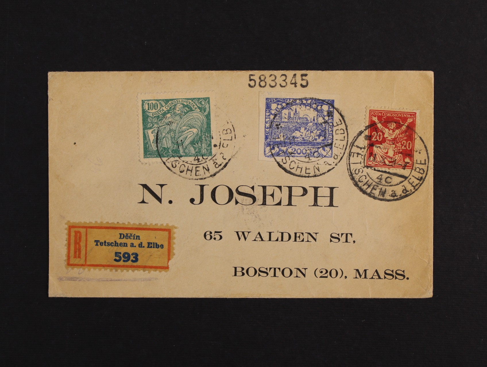 R-dopis do USA frank. na přední str. zn. č. 22 + zn. OR a HaV, na zadní str zn. č. 1 C (2x), + zn. 2, pod. raz. DĚČÍN 11.10.20, průch. a přích. raz. BOSTON 30.10.20