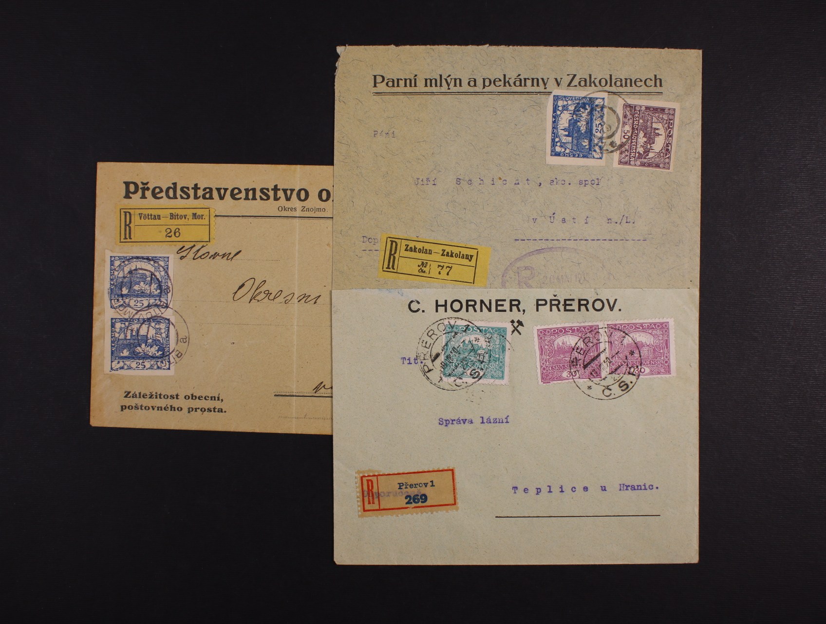 sestava 3 firemních R-dopisů s násobnou, resp. smíš. frankaturou Hradčan s raz. BÍTOV NA MOR., PŘEROV 1, ZÁKOLANY, dobrá kvalita