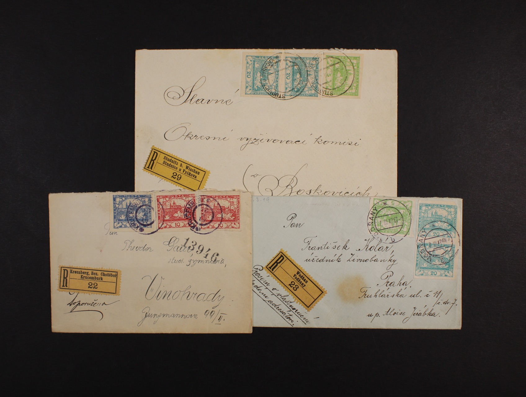 sestava 3 R-dopisů frank. smíš. frankaturou Hradčan s raz. KRUCEMBURG, STUDNICE U VYŠKOVA, VODŇANNY, zajímavé