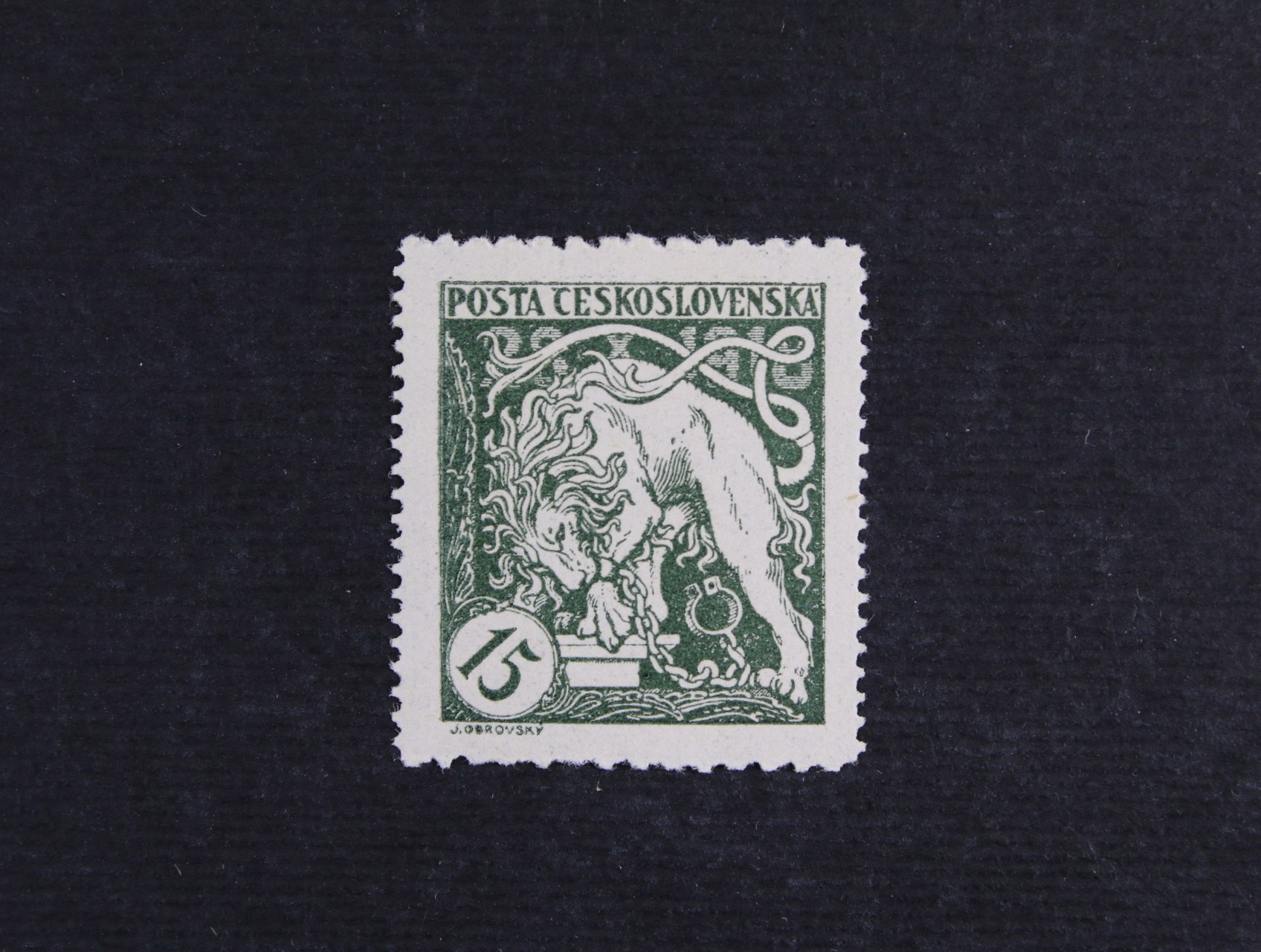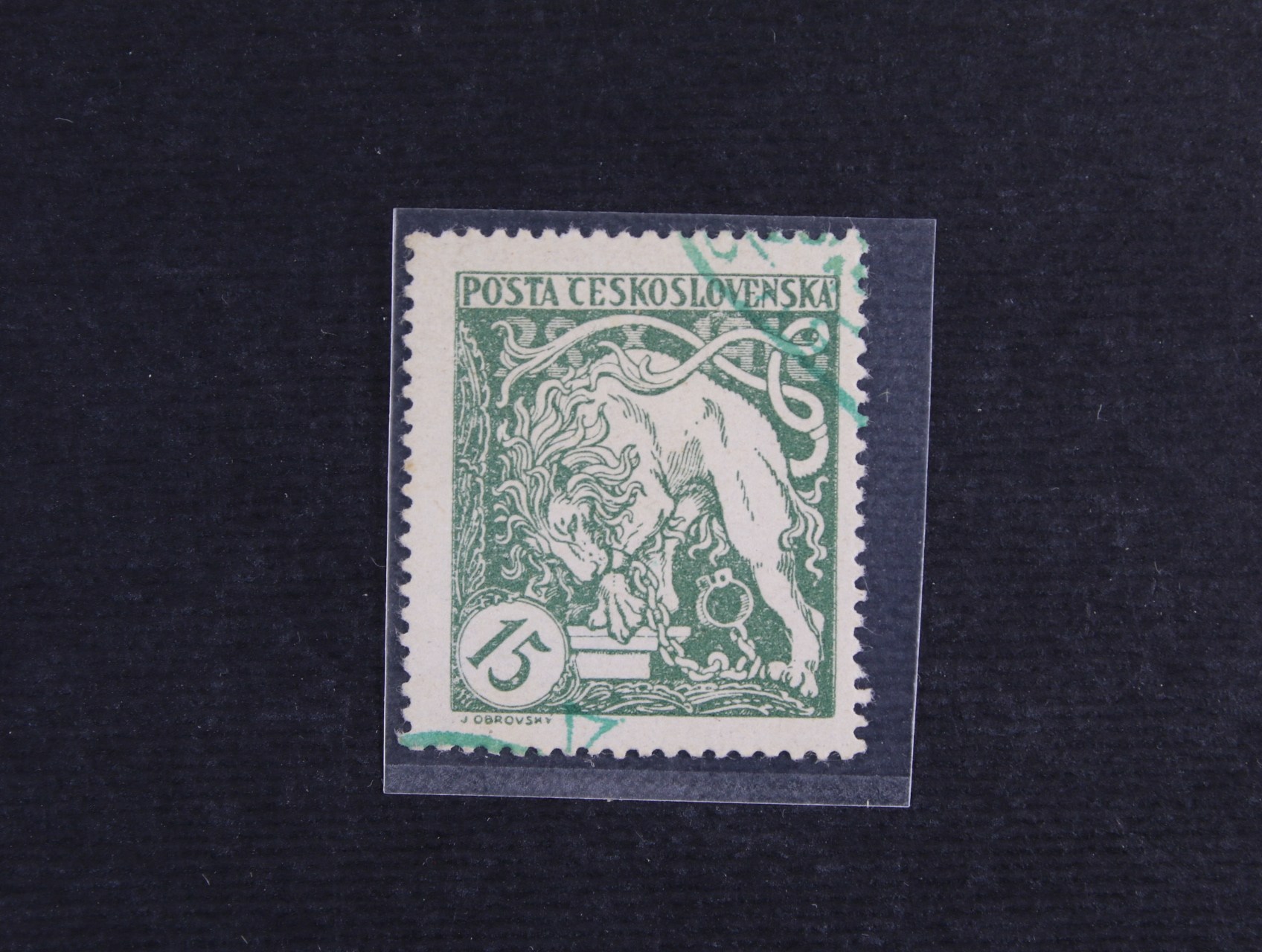 zn. č. 27 Aa 15h světle zelená s částí přítisku, zk. Gilbert, Karásek