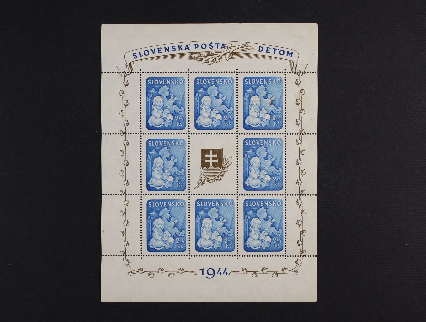 zn. č. 46z kompletní miniatura s DZ A1 a Dch zp. 9 "žrď na streche", dvl na pravém spodním čtyřbloku, místy lehce natrhlé perforace okraje