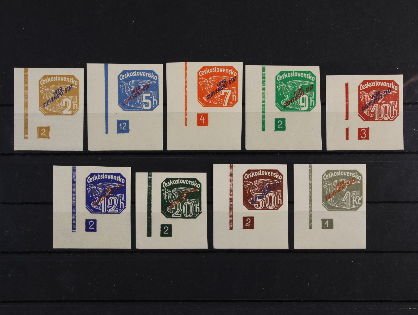 zn. NV č. 1 - NV 9 -levé spodní roh. čtyřbloky s DZ 1, 12, 4, 2, 3, 2, 2, 2, 1, zn. č. 8 a 9 zk. Novotný, kat. cena 130 EUR